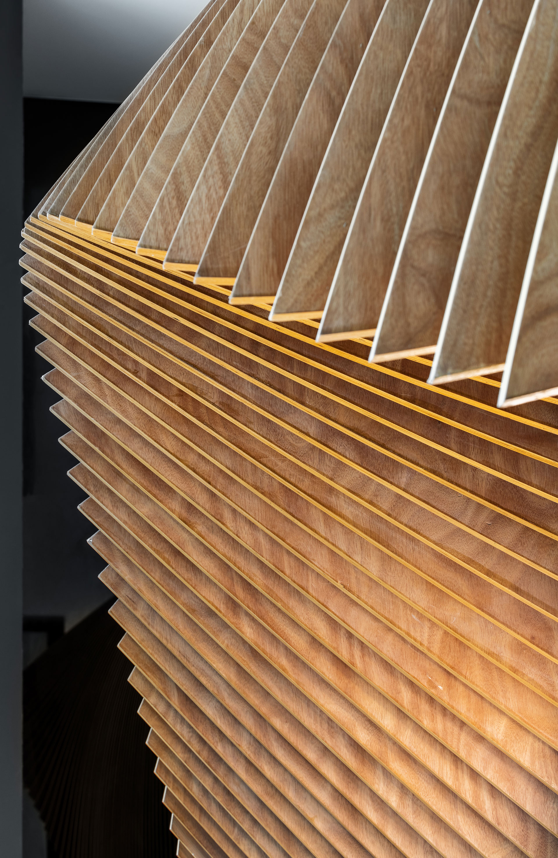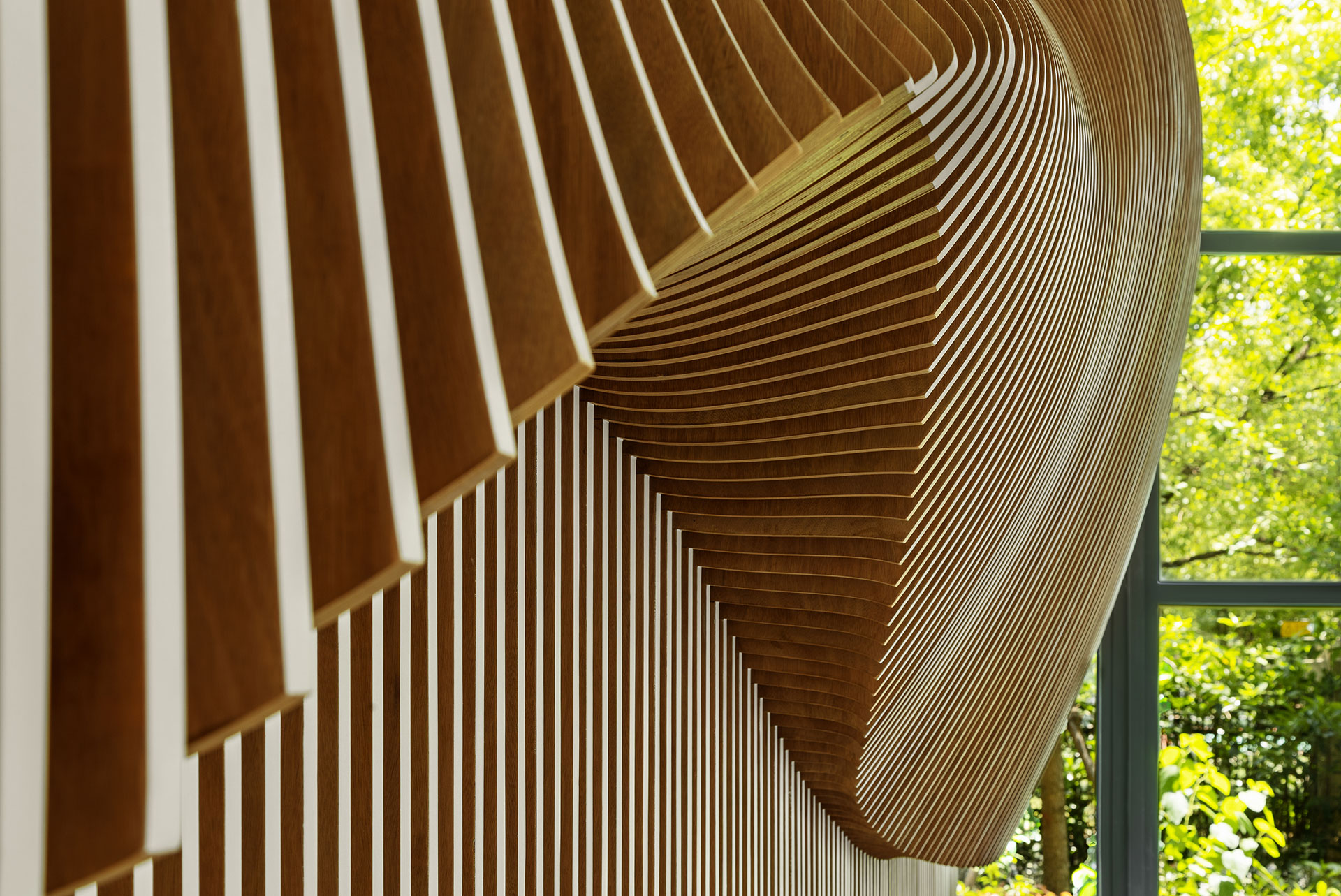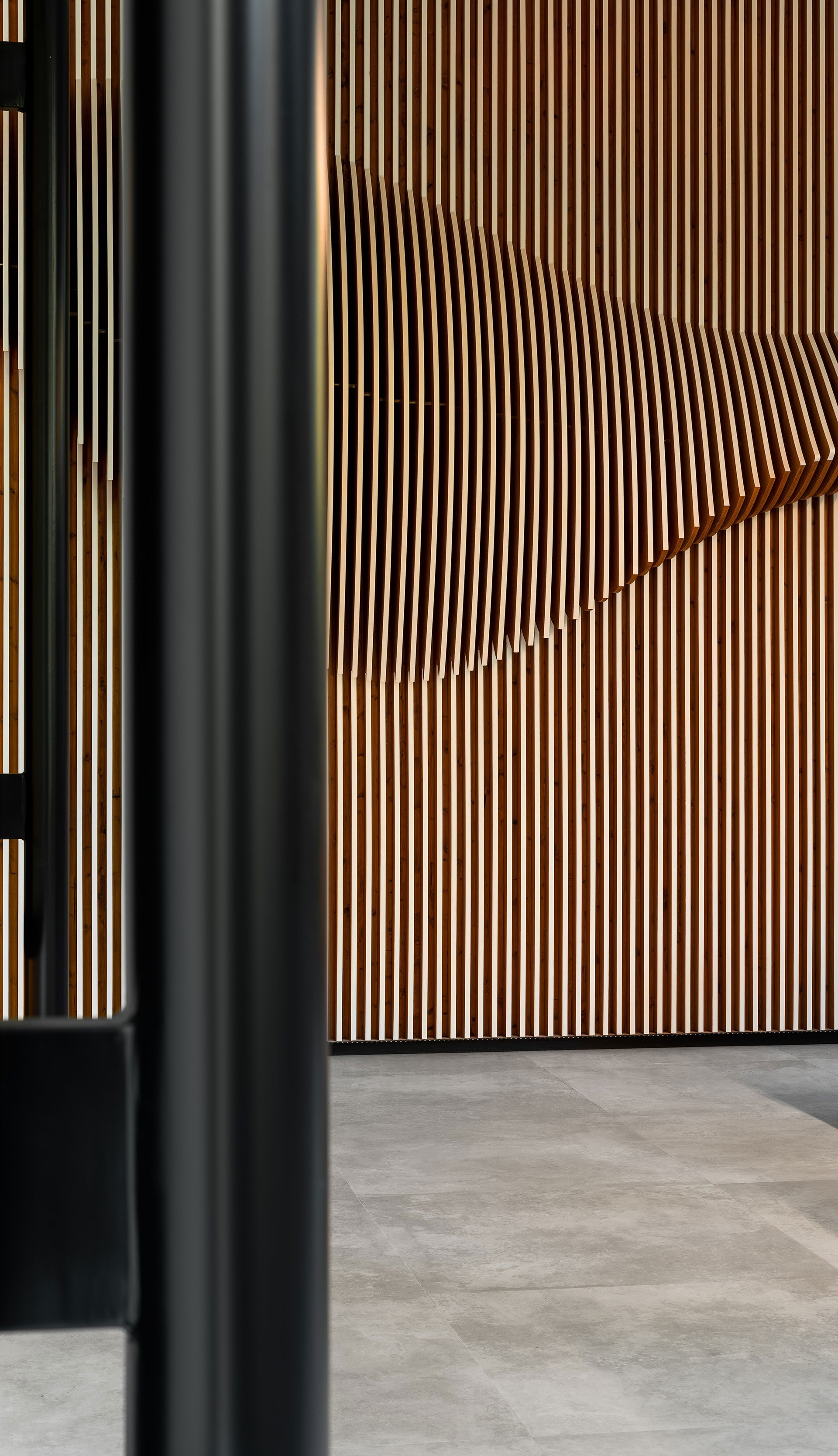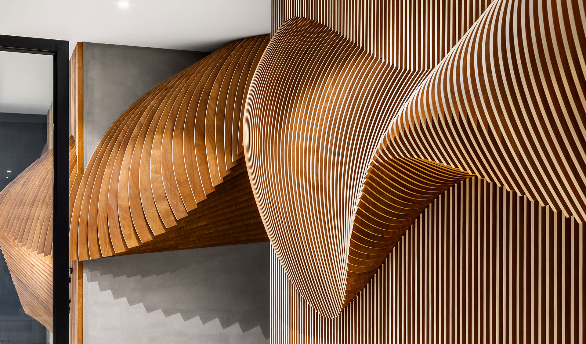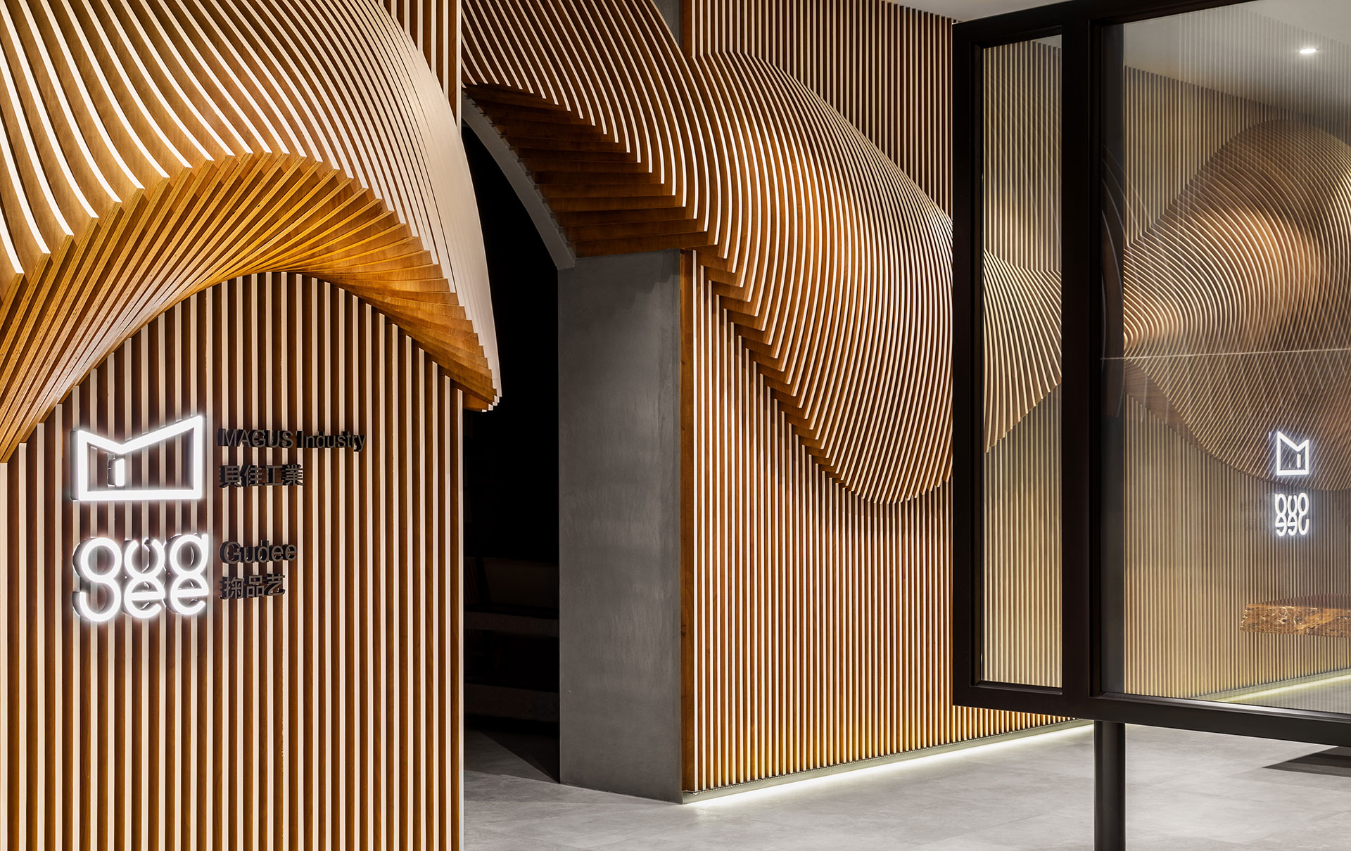 一樓展示中心,需具有企業形象的門面,我們以一條布翻飛的定格凝態作為類雕塑的主牆,以電子運算出千根細竹序列成排,凹與凸、拉出弧形躍動線條,立體化各角度的視覺感,並在竹子的正立面塗上白漆,以輕盈化量體,緩緩湧現布的質感,一如風動裙飛的姿態,軟變硬,賦予材質動態化,以回應竹編與木作兩種材質的相容創意。