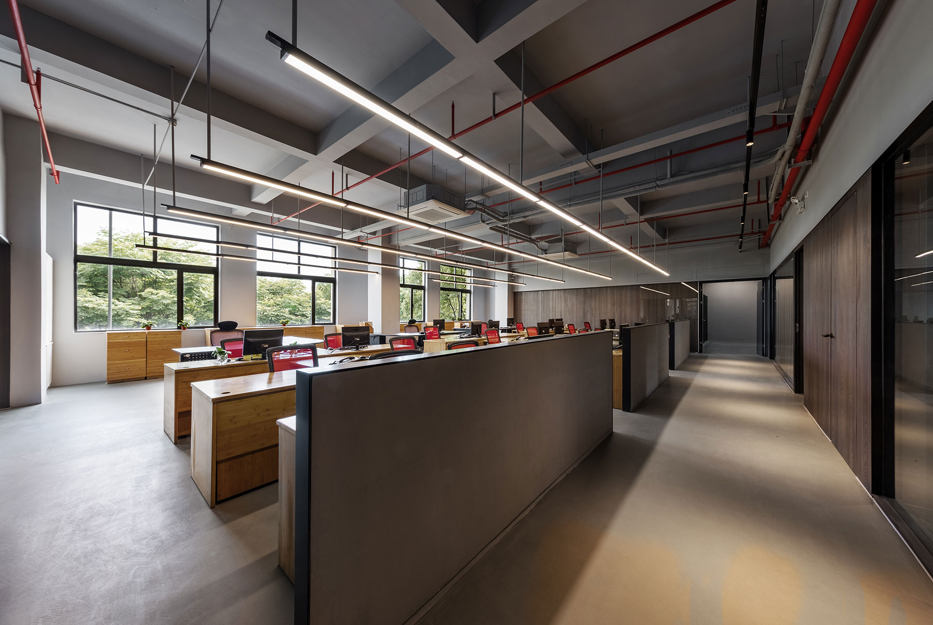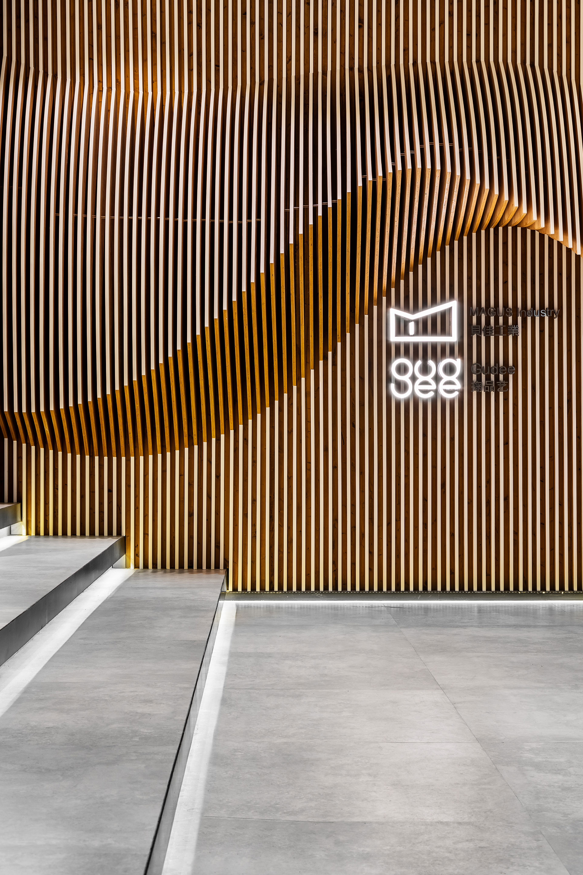 樓棟層高五樓,一樓展間、二樓辦公室、三到五樓則是工廠區,結合紡織加工、創新行銷及展售店面,將一件產品的生產到銷售程式鏈結於同一大樓。其中接待大廳極具動態的類雕塑主牆,以竹藝仿造立體織品,不僅扣合產品的重要元素,展現優雅品牌形象,更與其他樓層的快節奏形成對比;此外亦適時搭佐鐵件、玻璃與智慧膜等元素,確保場景保持開放且調度更為靈活,使置身其中的每位觀者,自在跟隨絲縷,游走於壯闊入微的空間紋理中。至於場景的另一面,則為半開放的會議空間,居中的鋁格柵金屬板覆以智慧膜,框隔微區域感之餘,亦指出區域開闔自由的聚談性質,為迎賓待客的送往需求,提供最具彈性的機能運用。