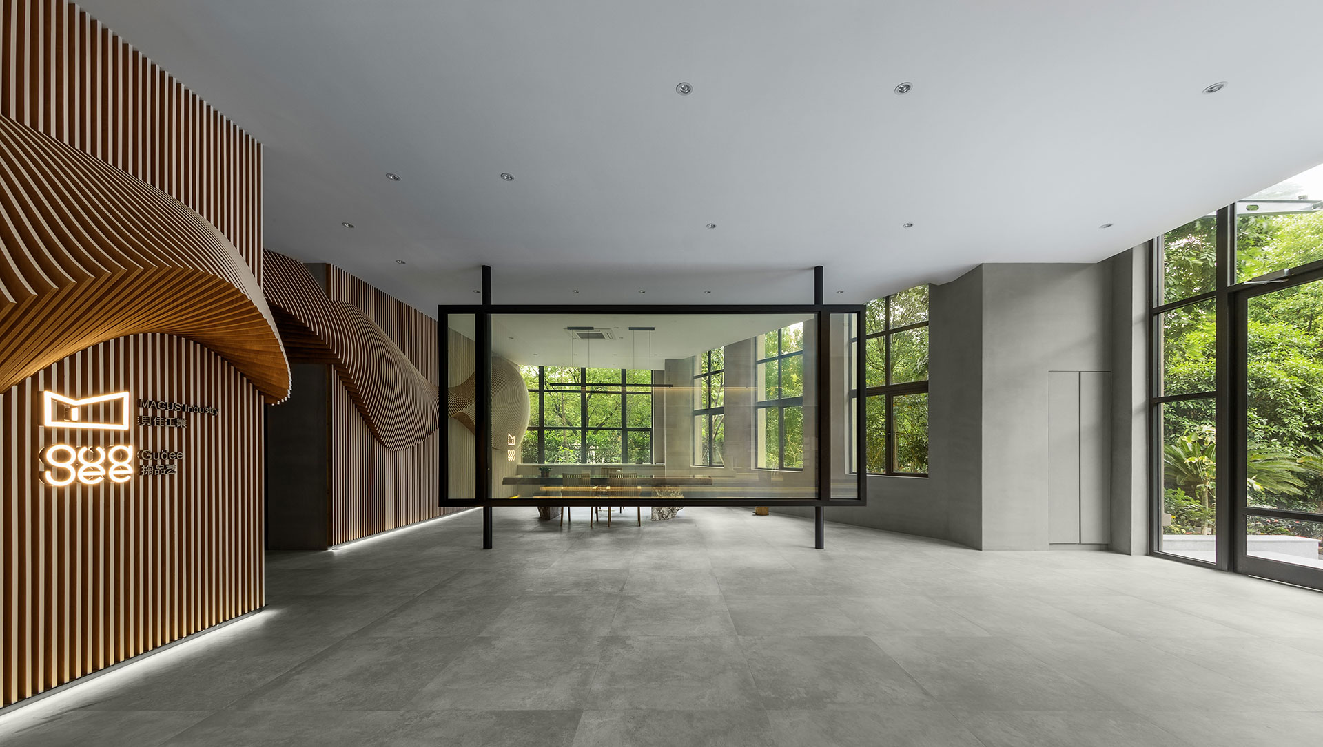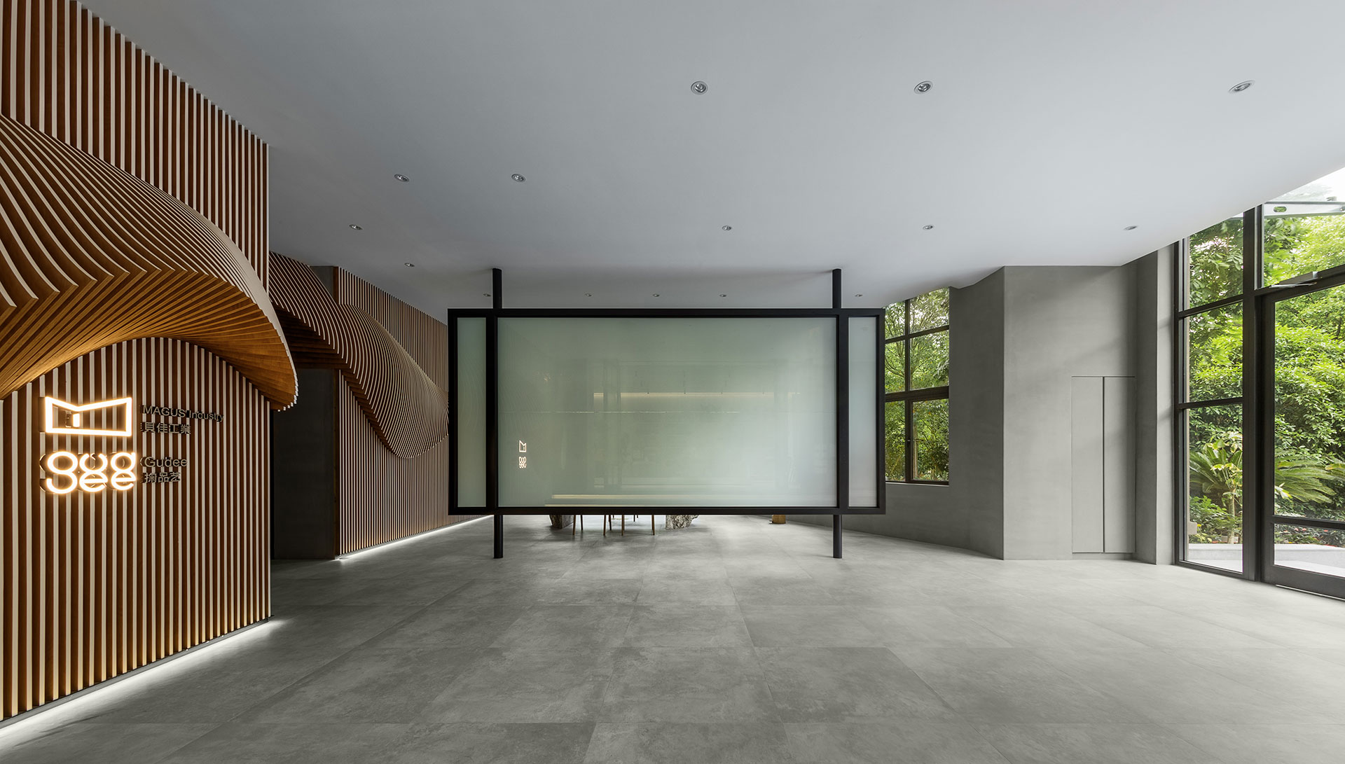 大廳兼具演講廳與展示廳的功能;展示區的中央島區、壁掛式展示孔架牆板,可拆可移,以創造空間變動性。正對展示區的階梯前,也是造型主牆另一側,用折門做為區隔兩端空間的弱界定。右側為半開放式的會議空間,以鐵件玻璃(上覆智能膜)框起微區域感,指示此區為開闔自由的聚談空間,將做為展示場域的商業往來需求,做最大彈性的機動運用。