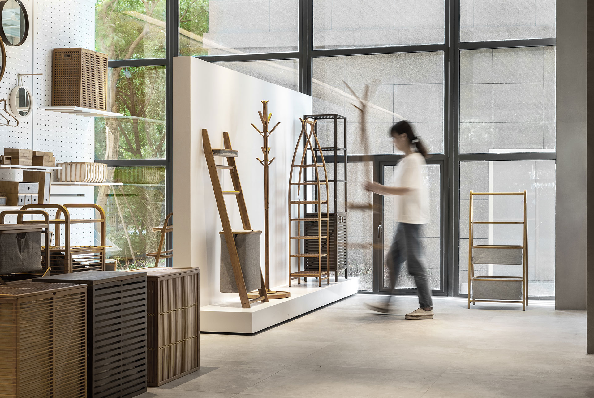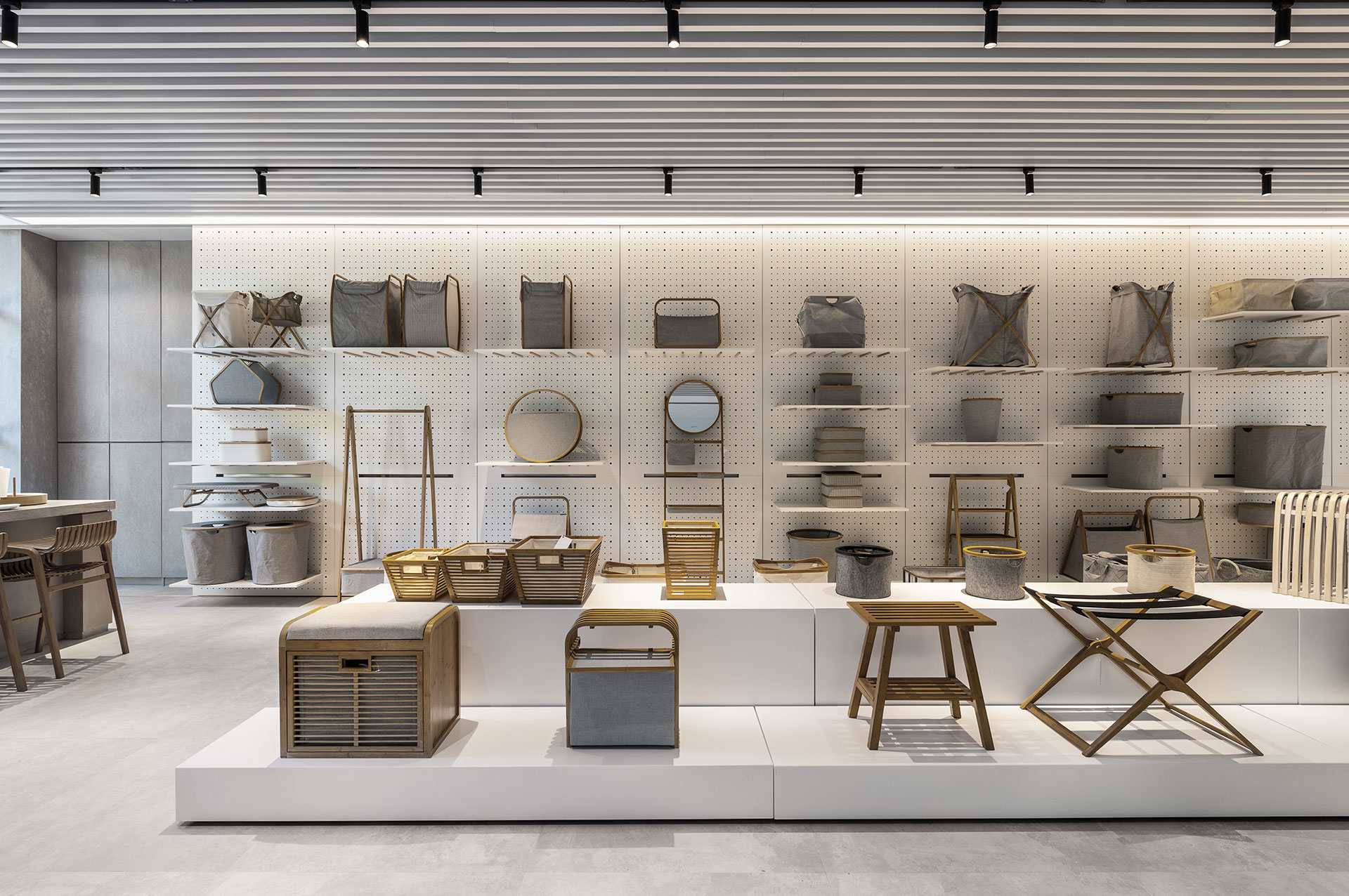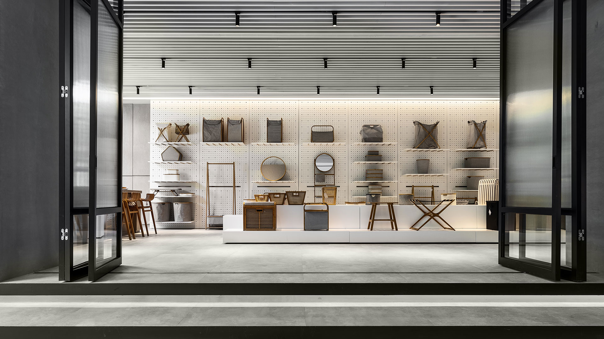 收合折疊門片所形塑的弱分界,原先霧面玻璃吸收的自然光線瞬間湧流,隨著石英磚逐步抬升,樓梯轉折延續牆腳的光帶裝置,將腳步輕盈地帶向展示區域。設計師考量品牌著重以布、竹媒材為主的家飾產品,因此場域色澤保持質樸簡約。
