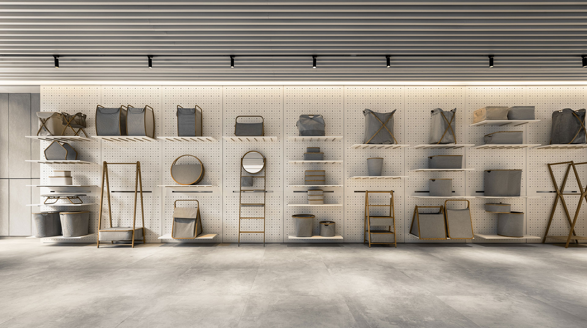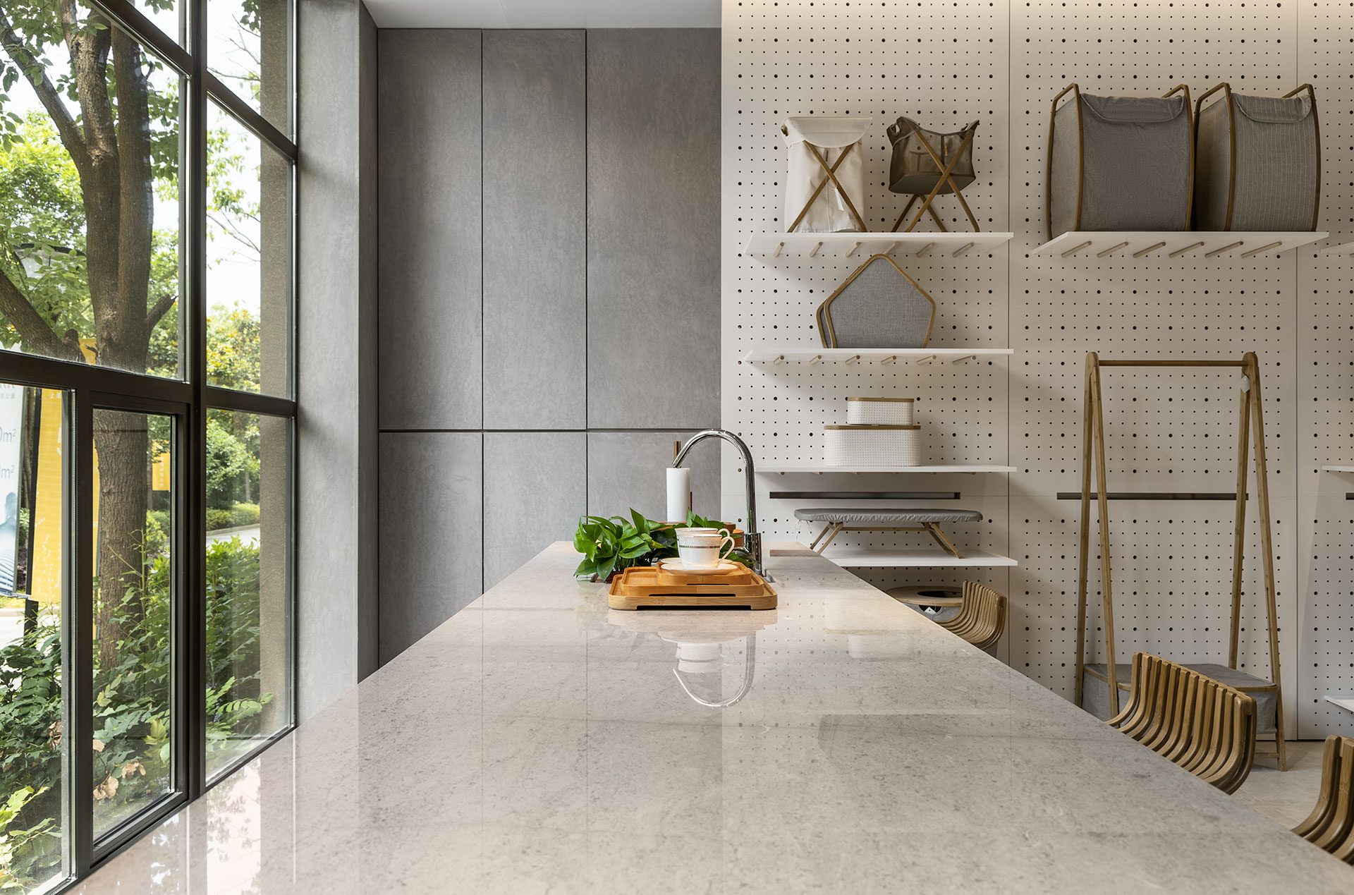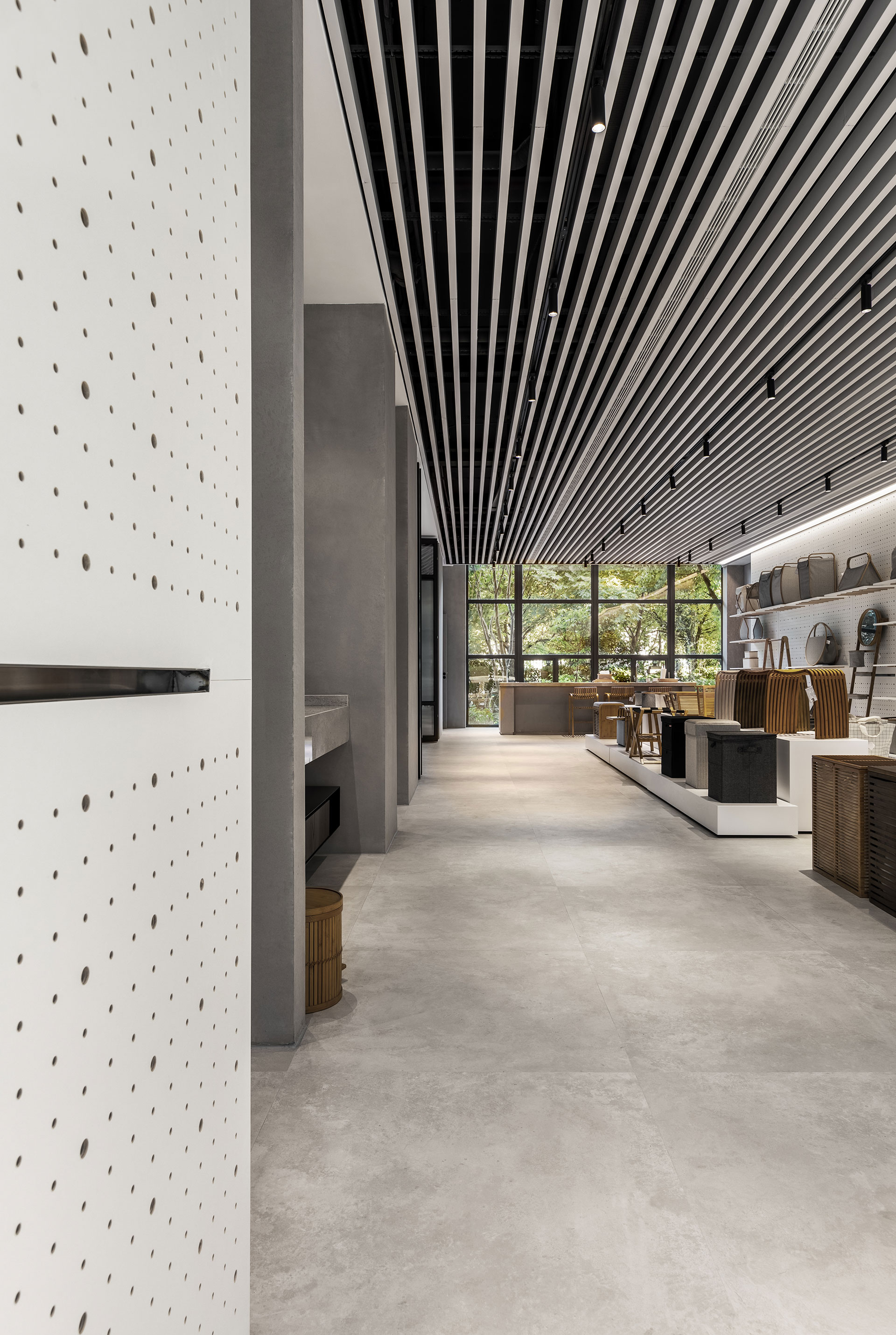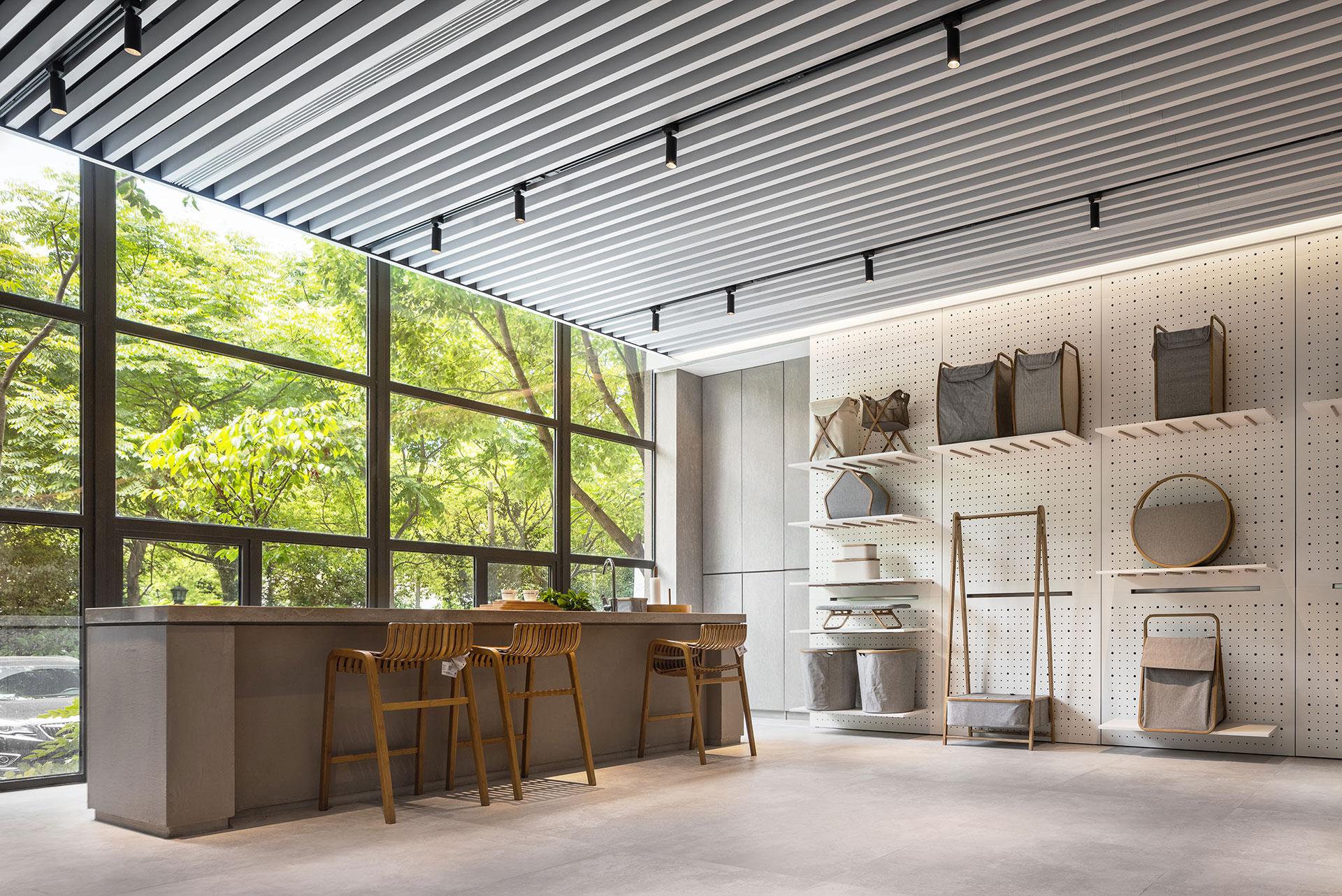 另外區域分佈同樣回歸簡單,分為臨窗的島台區塊與壁掛展區;前者以回字型動線,便於隨時取用所需,充分具備會談展示之用;後者則設置滑軌落地沖孔牆,搭配可拆卸的竹制卡榫與層板,隨物件尺寸彈性遷移,打造有如立面開箱的整齊視覺,一目了然全系列產品之餘,更為陳列提供豐富的展示選擇。