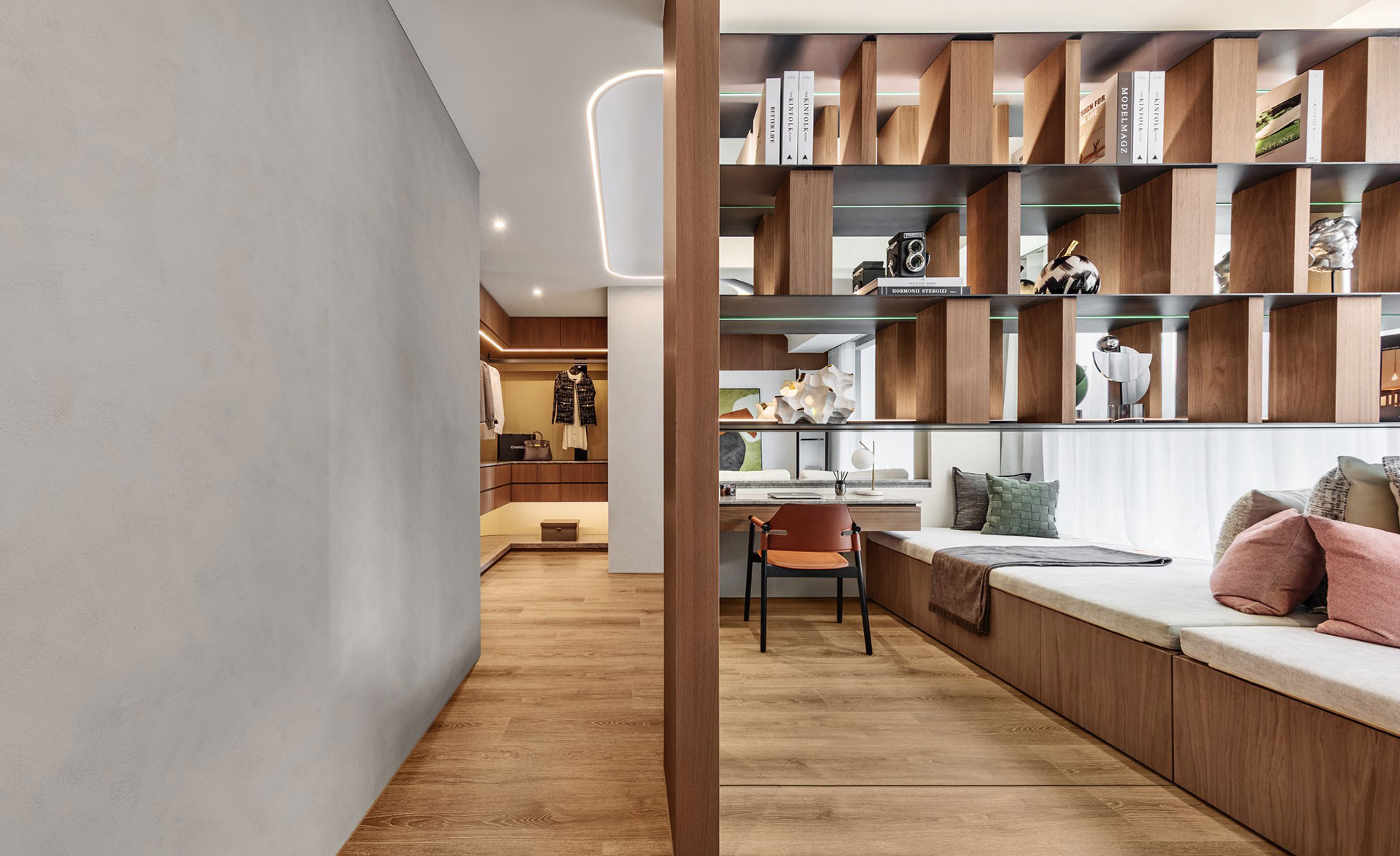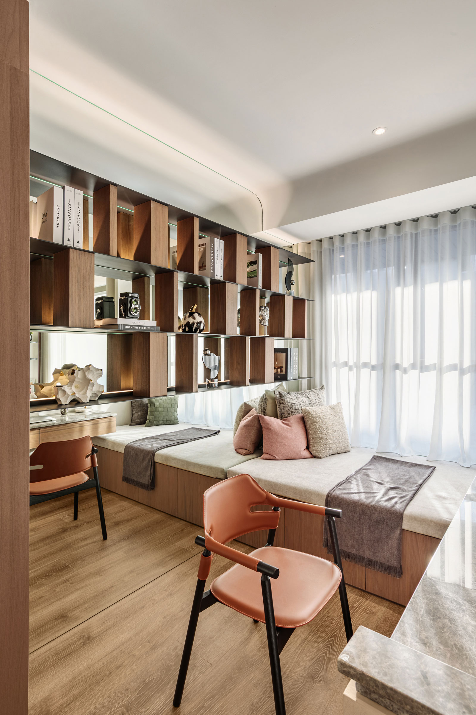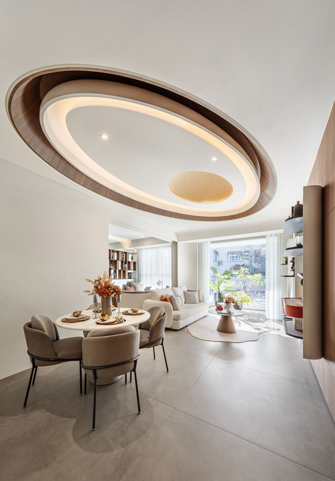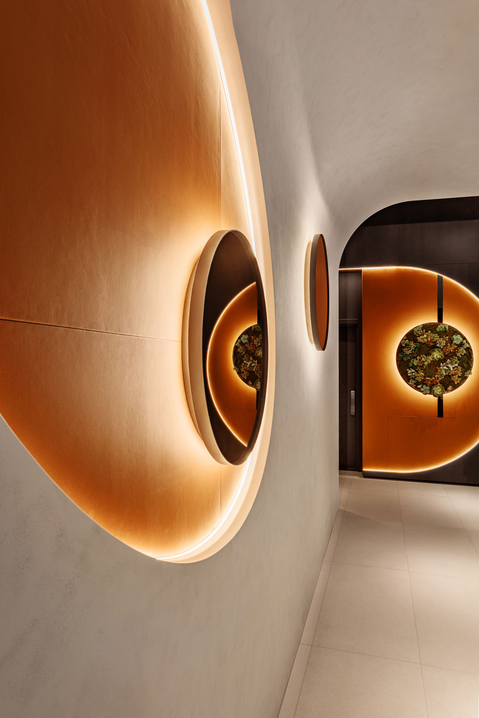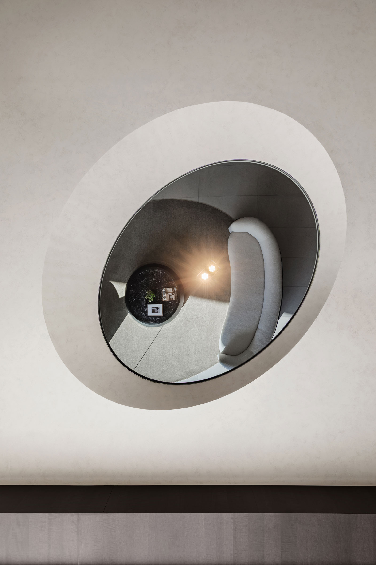 延續未來建築豎向半圓之特殊開窗形式,整個接待中心與樣品屋皆採曲面式造型設計,除了柔化室內空間之視覺體驗外,搭配細緻之細節設計,我們更想呈現出文藝復興年代,人們對美學與儀式感之空間價值觀與生活態度,讓人再次憶起數十年前孩童巷弄嬉戲奔跑之都市悠活空間情境。