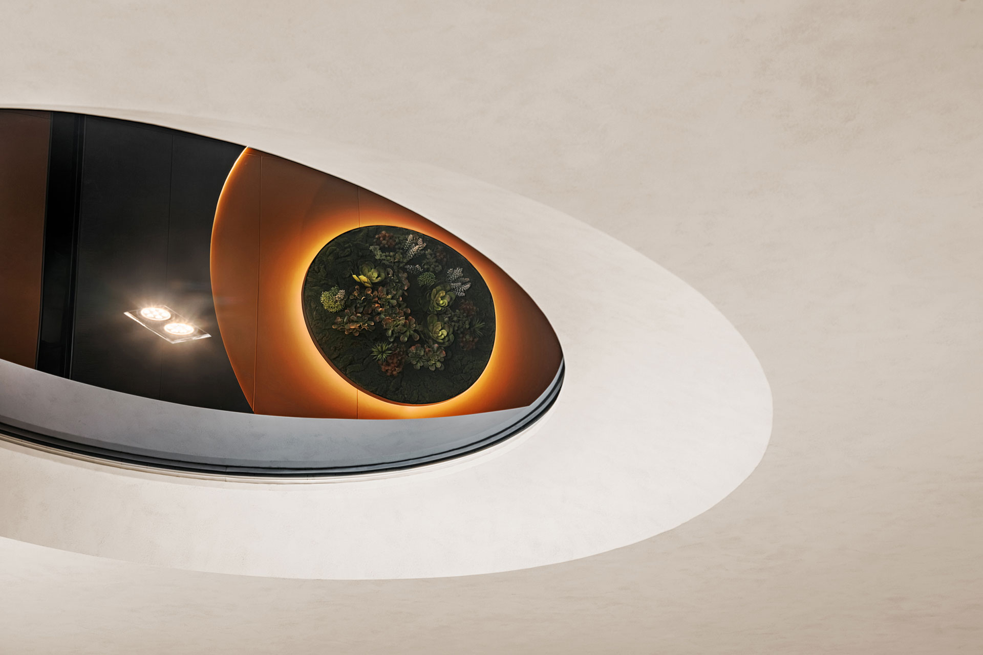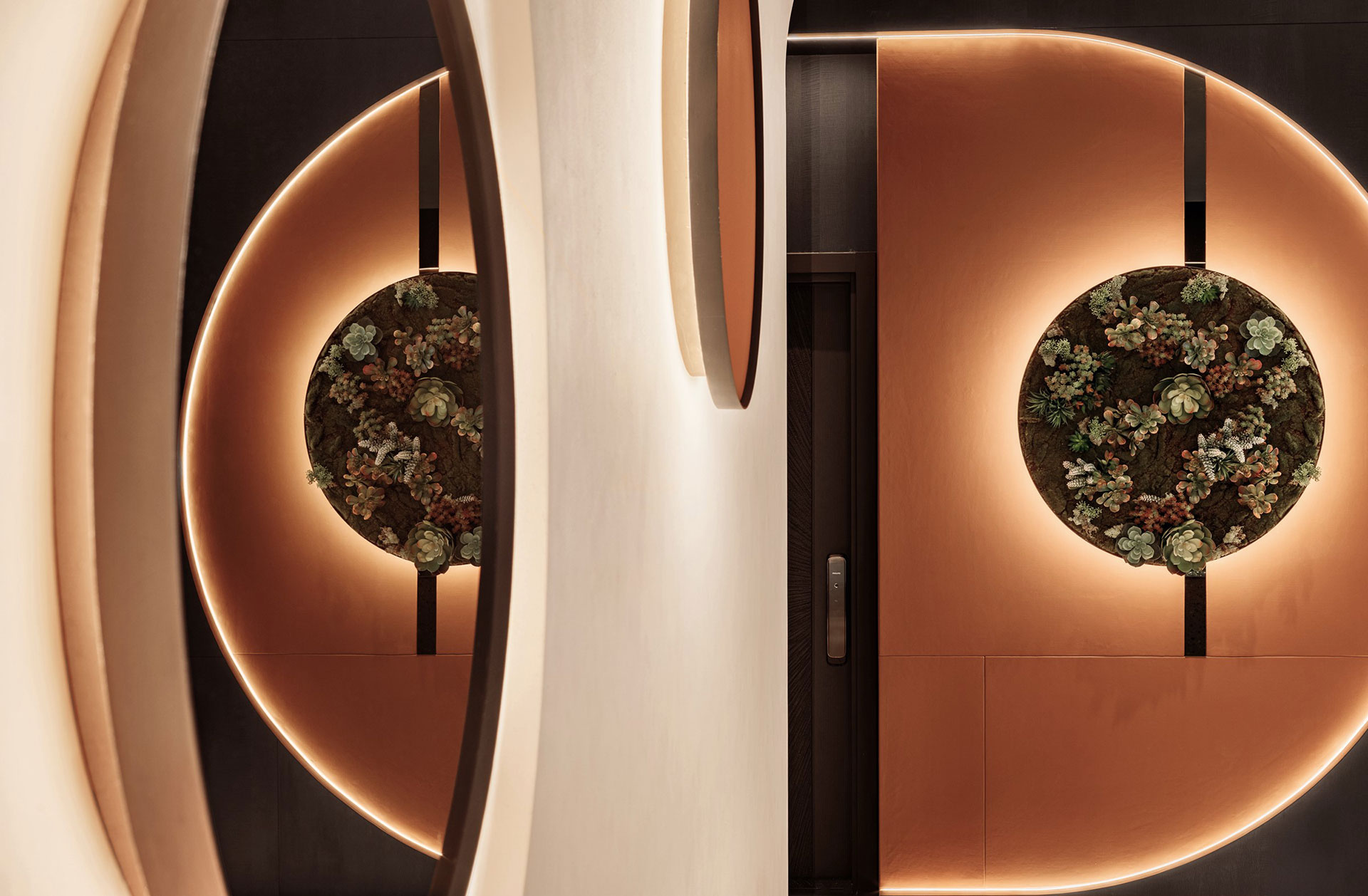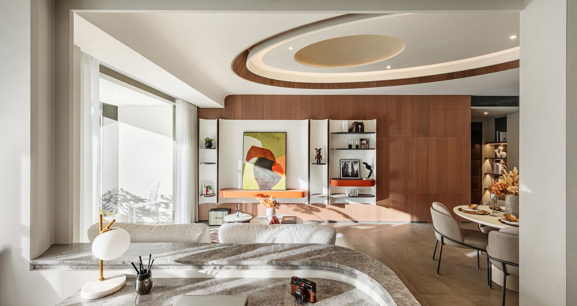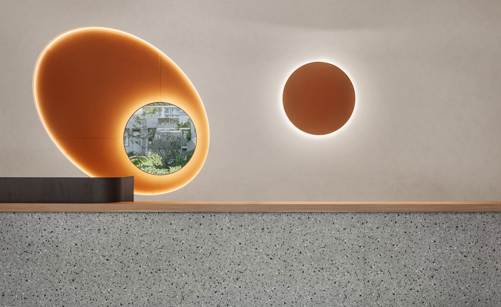 延續未來建築豎向半圓之特殊開窗形式,整個接待中心與樣品屋皆採曲面式造型設計,除了柔化室內空間之視覺體驗外,搭配細緻之細節設計,我們更想呈現出文藝復興年代,人們對美學與儀式感之空間價值觀與生活態度,讓人再次憶起數十年前孩童巷弄嬉戲奔跑之都市悠活空間情境。