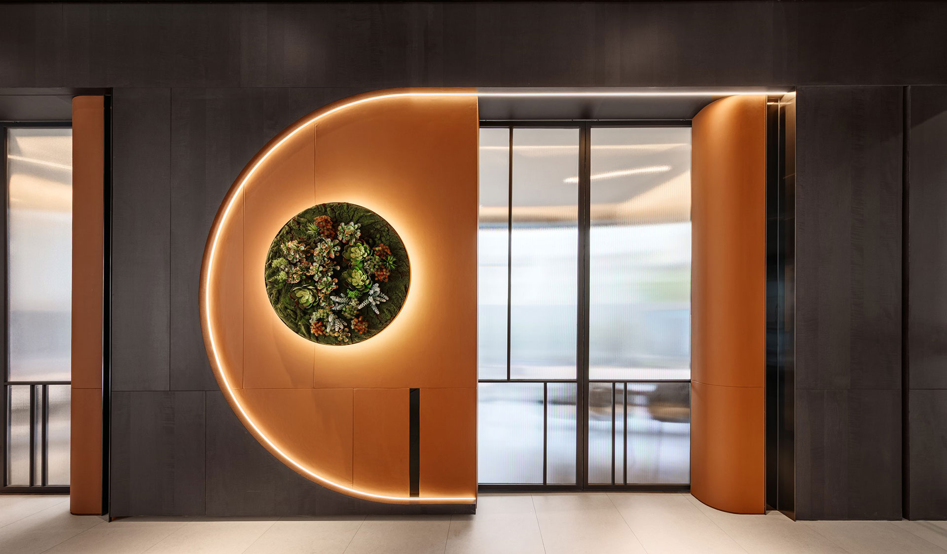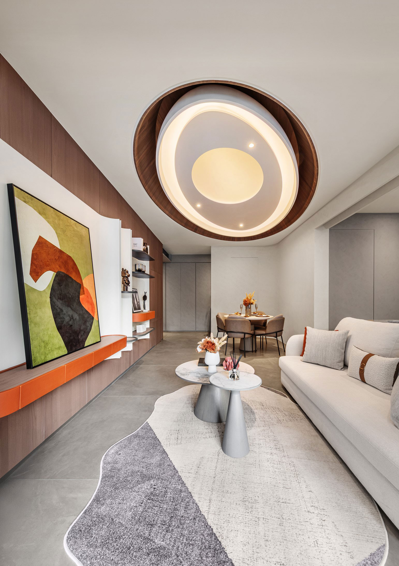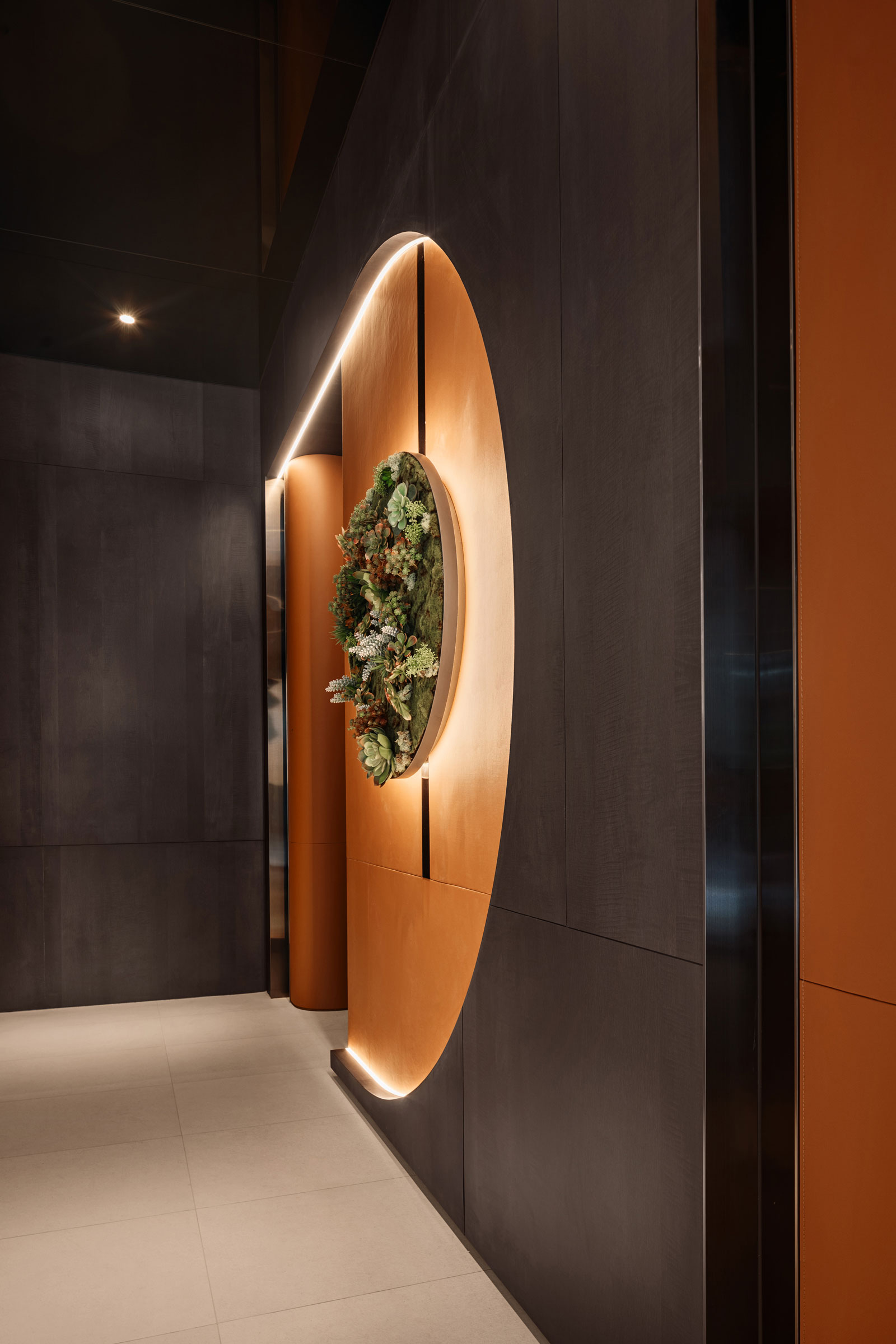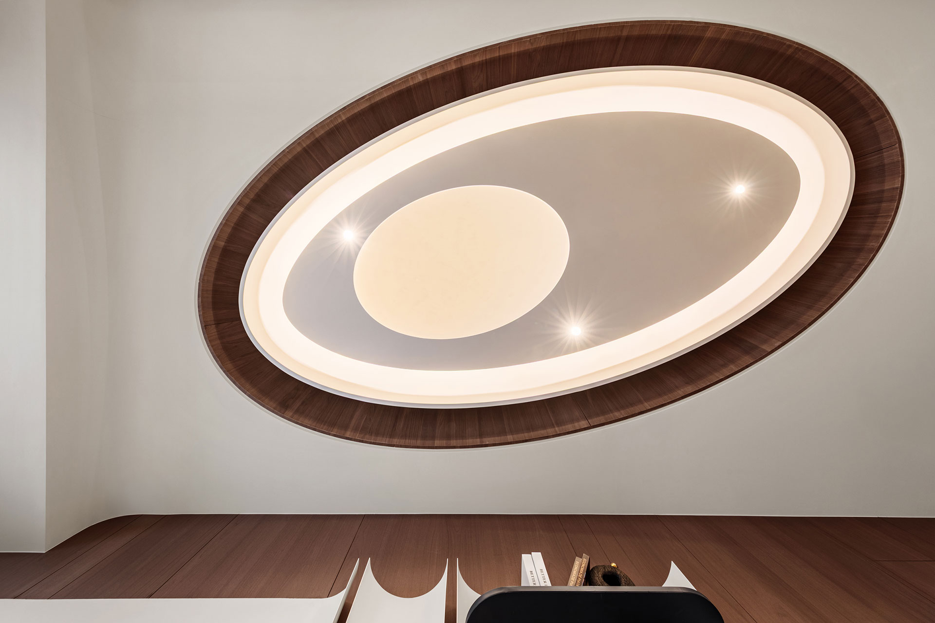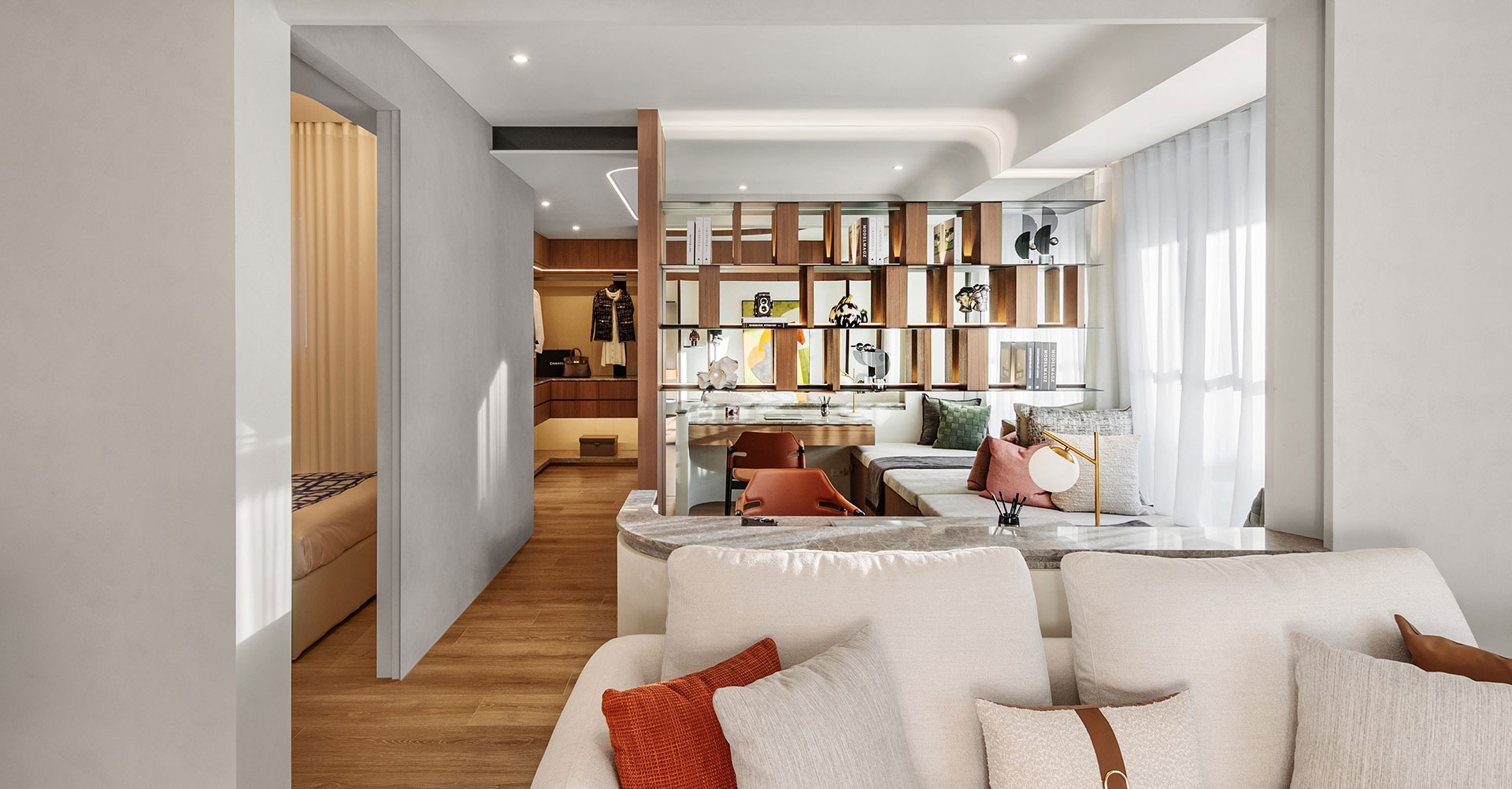 延續未來建築豎向半圓之特殊開窗形式,整個接待中心與樣品屋皆採曲面式造型設計,除了柔化室內空間之視覺體驗外,搭配細緻之細節設計,我們更想呈現出文藝復興年代,人們對美學與儀式感之空間價值觀與生活態度,讓人再次憶起數十年前孩童巷弄嬉戲奔跑之都市悠活空間情境。