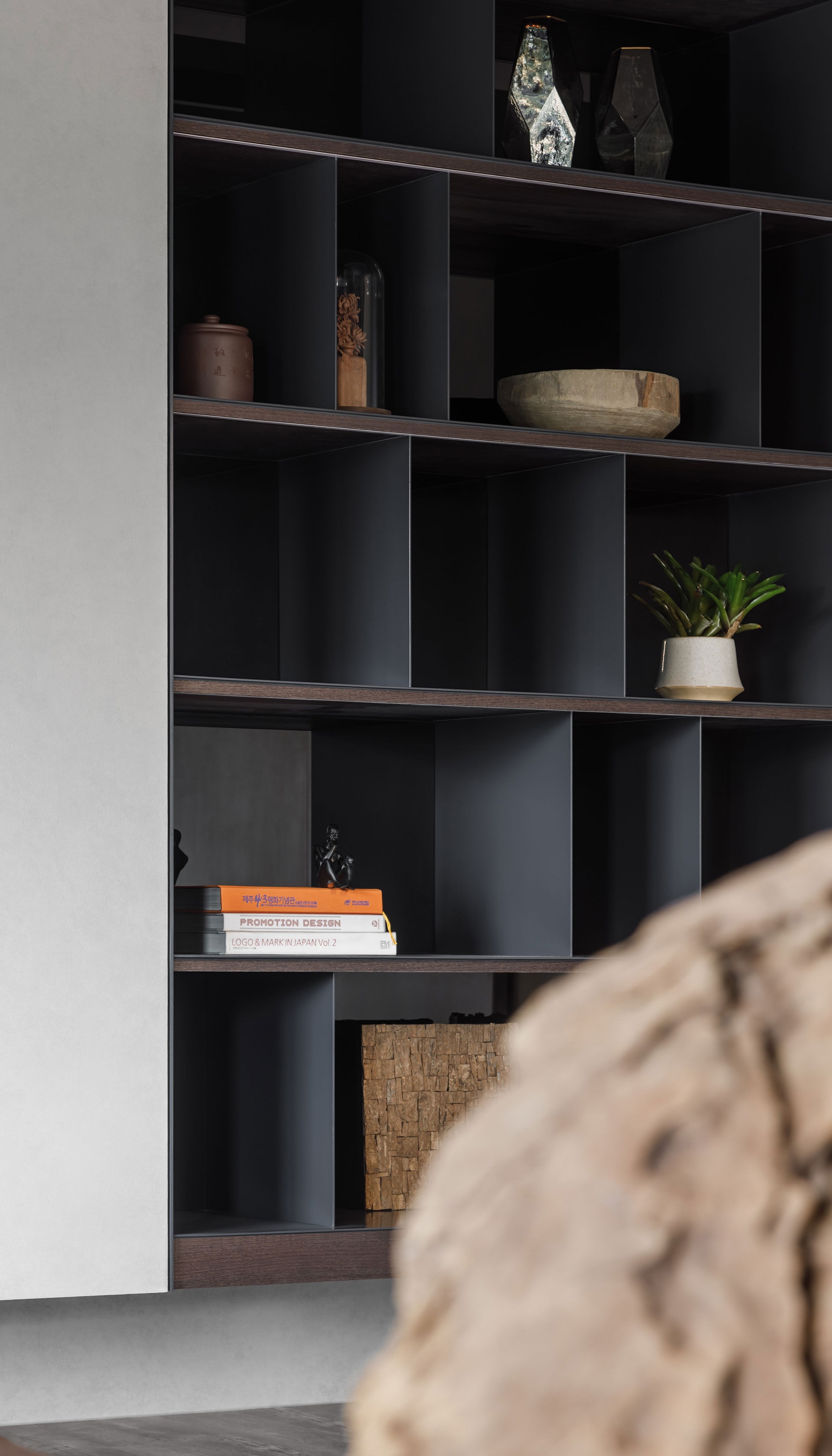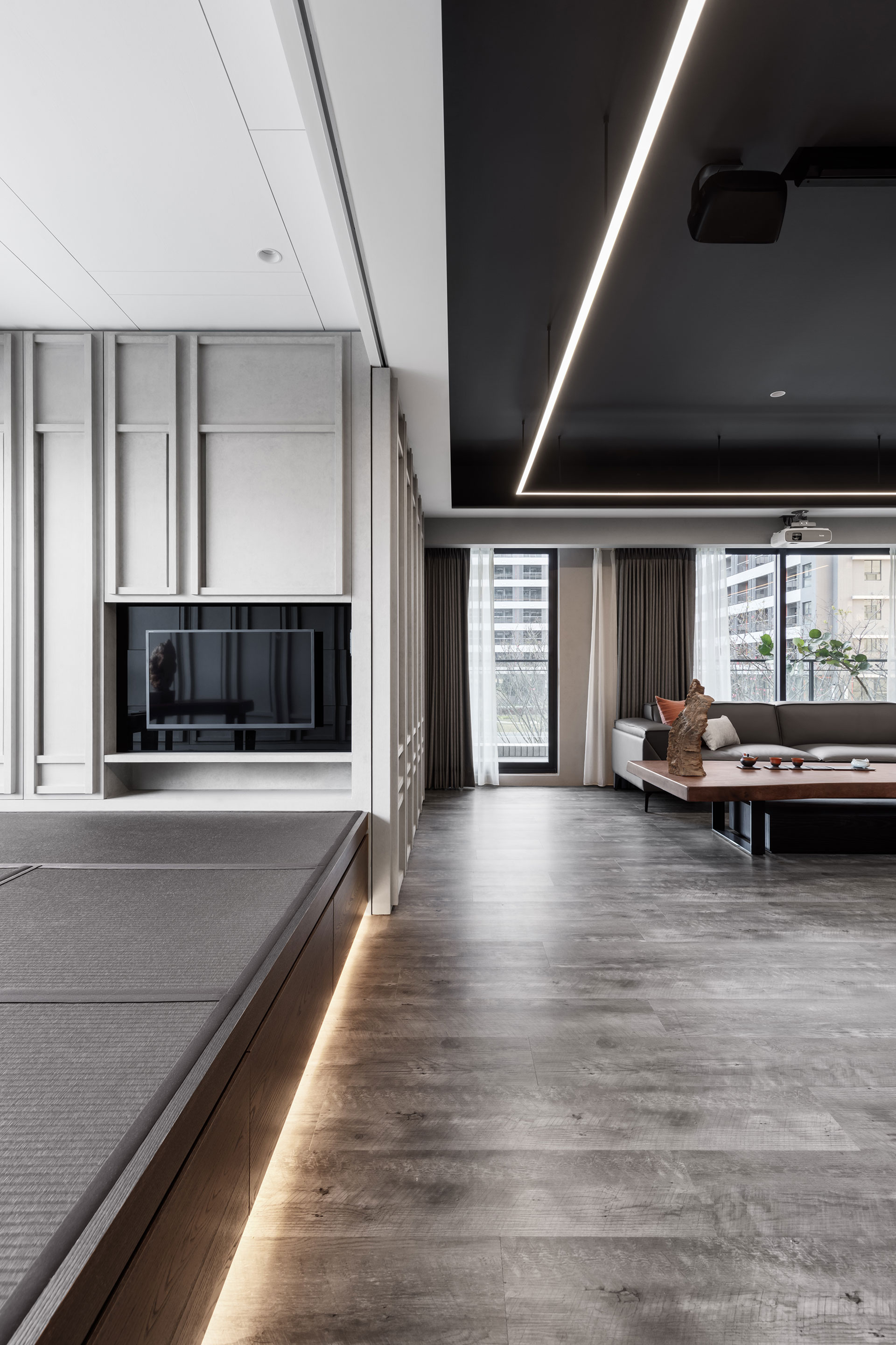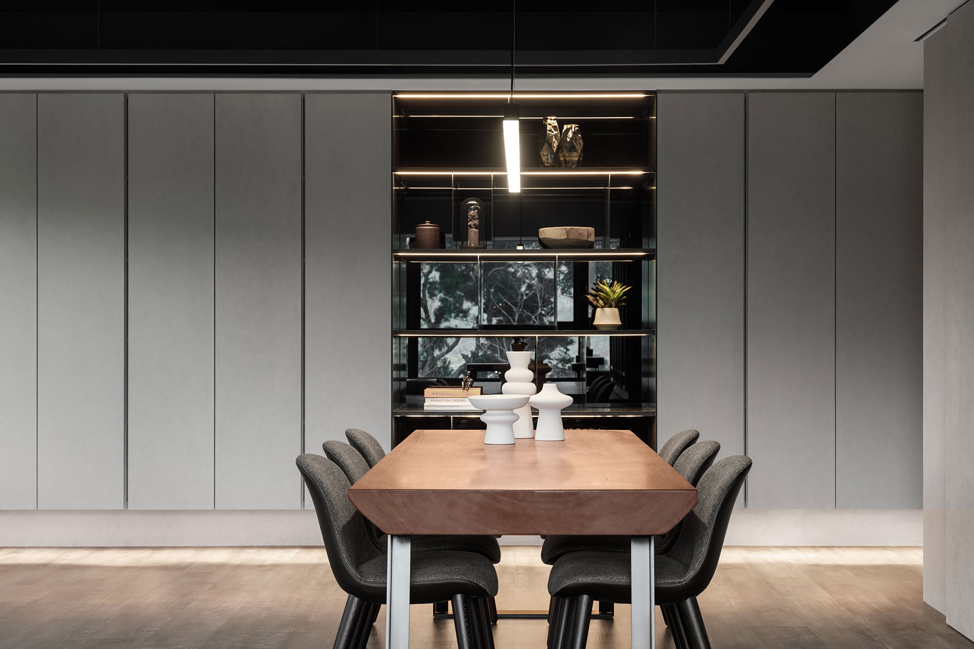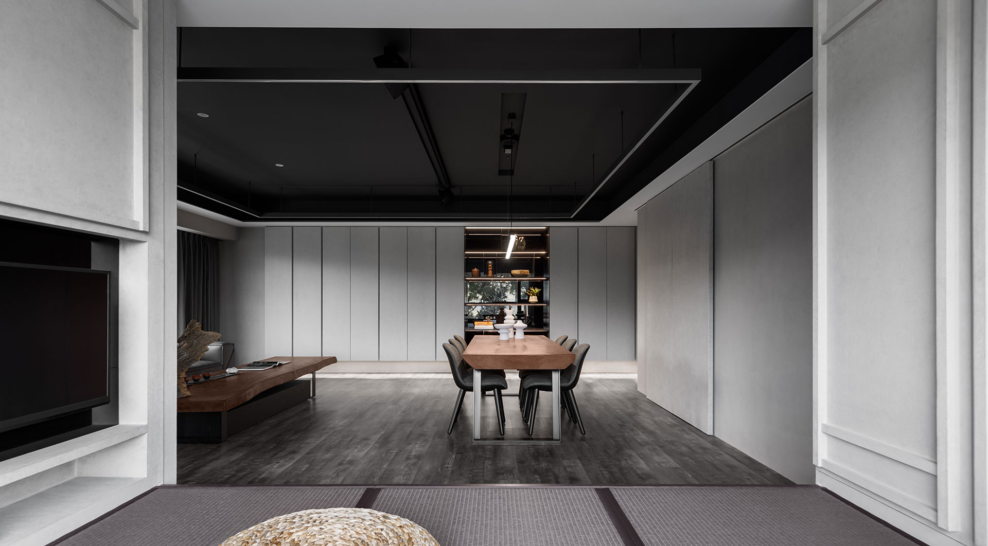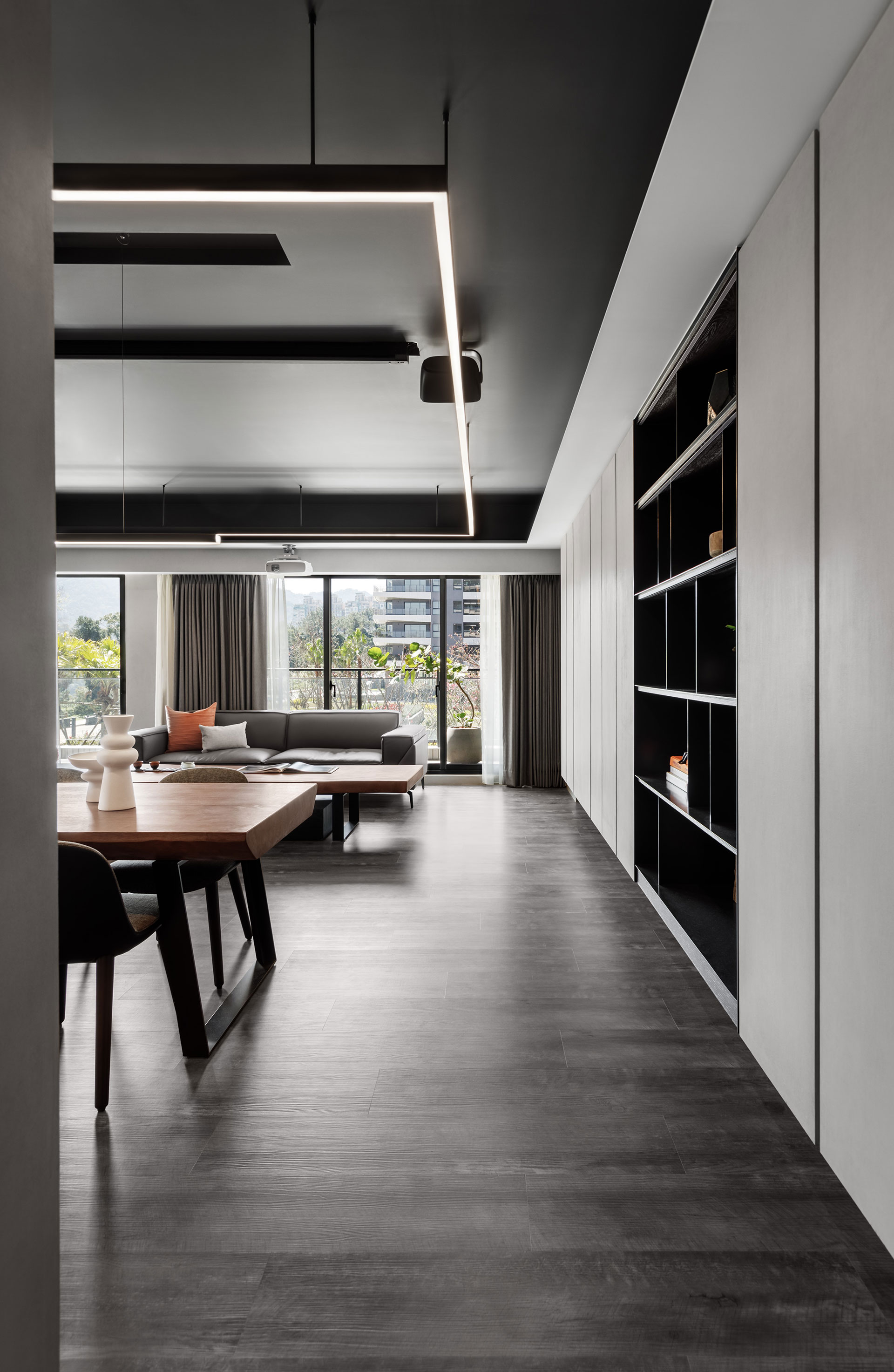 在開放空間中央配置大長桌,形成一口字形動線,屋主希望能在家裡擁有一種遊走的自由感。所有牆體皆有機能設置或是開口,升降屏幕與投影設備規劃便完整了視聽娛樂的需求,也因為這樣的彈性規劃,整個開放空間更能乘載多樣化的生活樣貌。