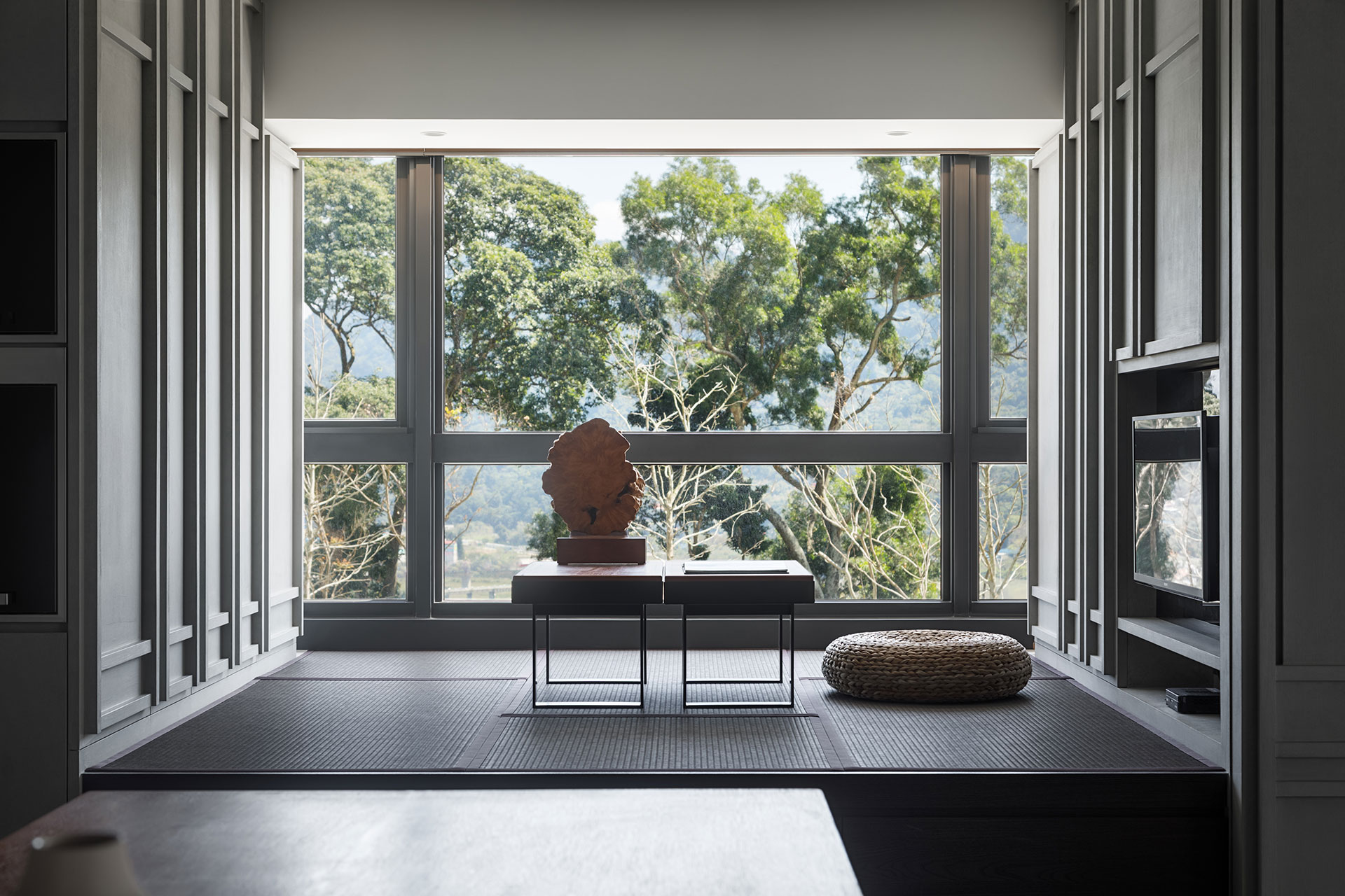 將屋外美不勝收的自然景致帶入室內,同時引入窗外的光與風。在設計的對策上,將和室留設大尺度水平拉門,結合沙發側之落地窗,雖處室內,視覺卻能延伸至四周環抱之翠綠山景,陽光的滲入與空氣的對流讓室內的人與室外的自然元素產生最佳的感受與連結。