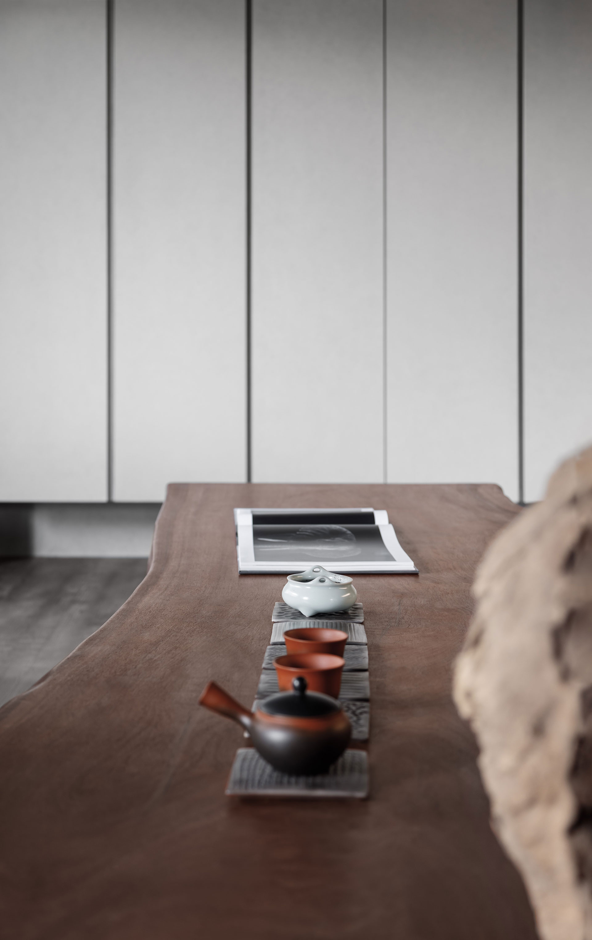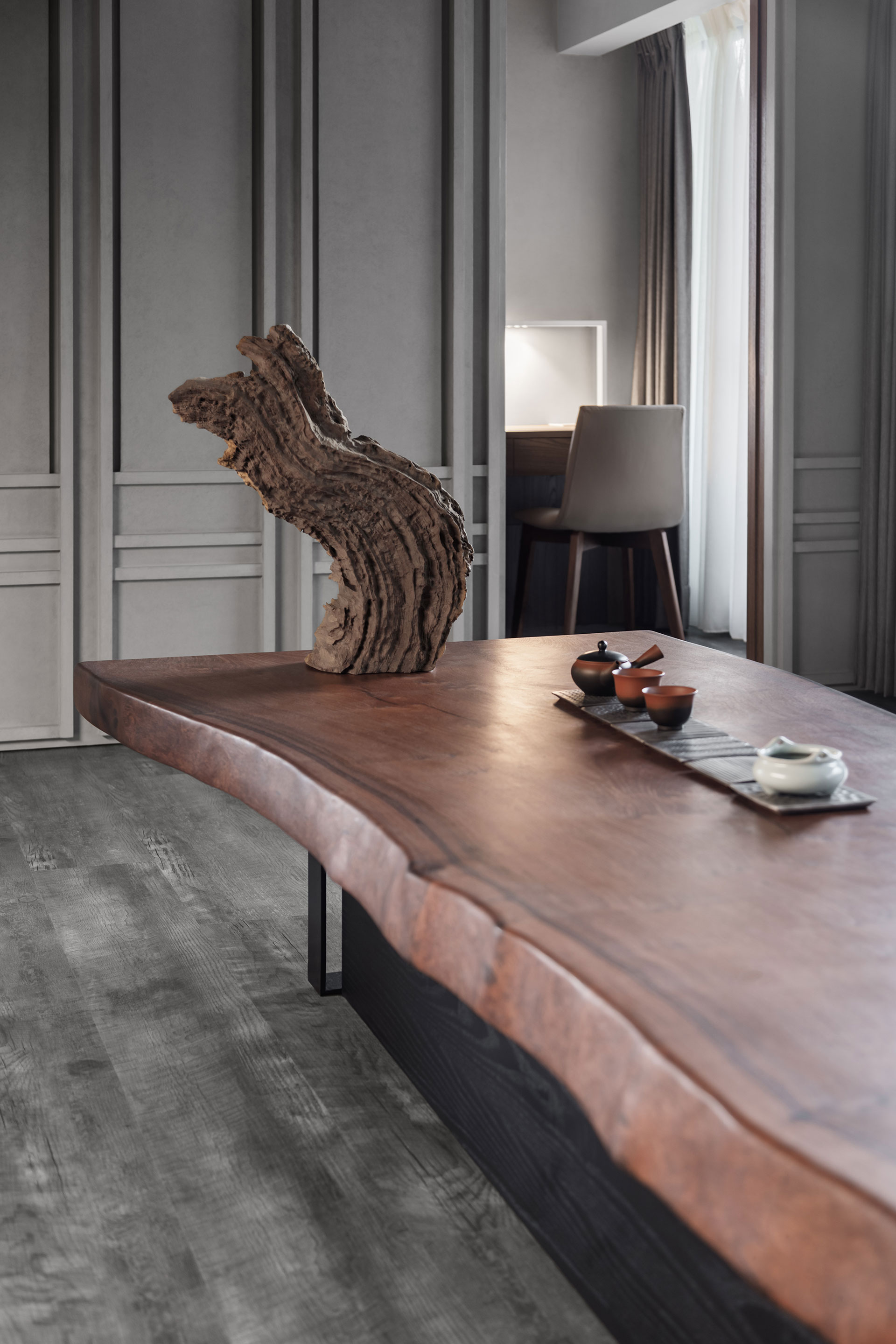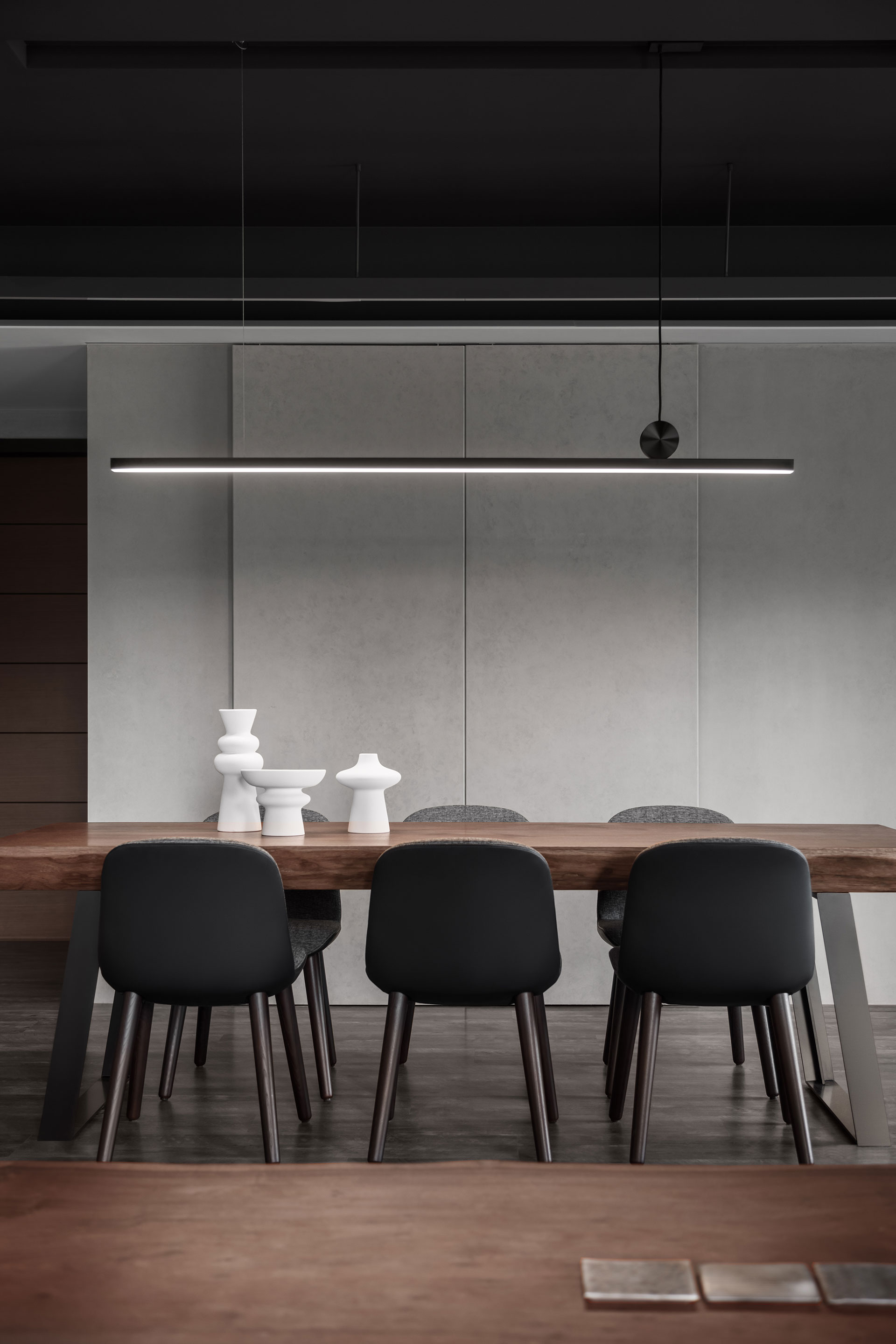 一個矩形完整的空間,用了一種最簡單的材質鋪陳出空間的基調,在此空間中置入二張大尺度原木長桌,長桌質樸的表面質感與自然有機的形體定義了空間的調性,同時暗喻乘載了屋主的個性,何謂合適的設計,應當就是 - 恰如其分,適得其所。