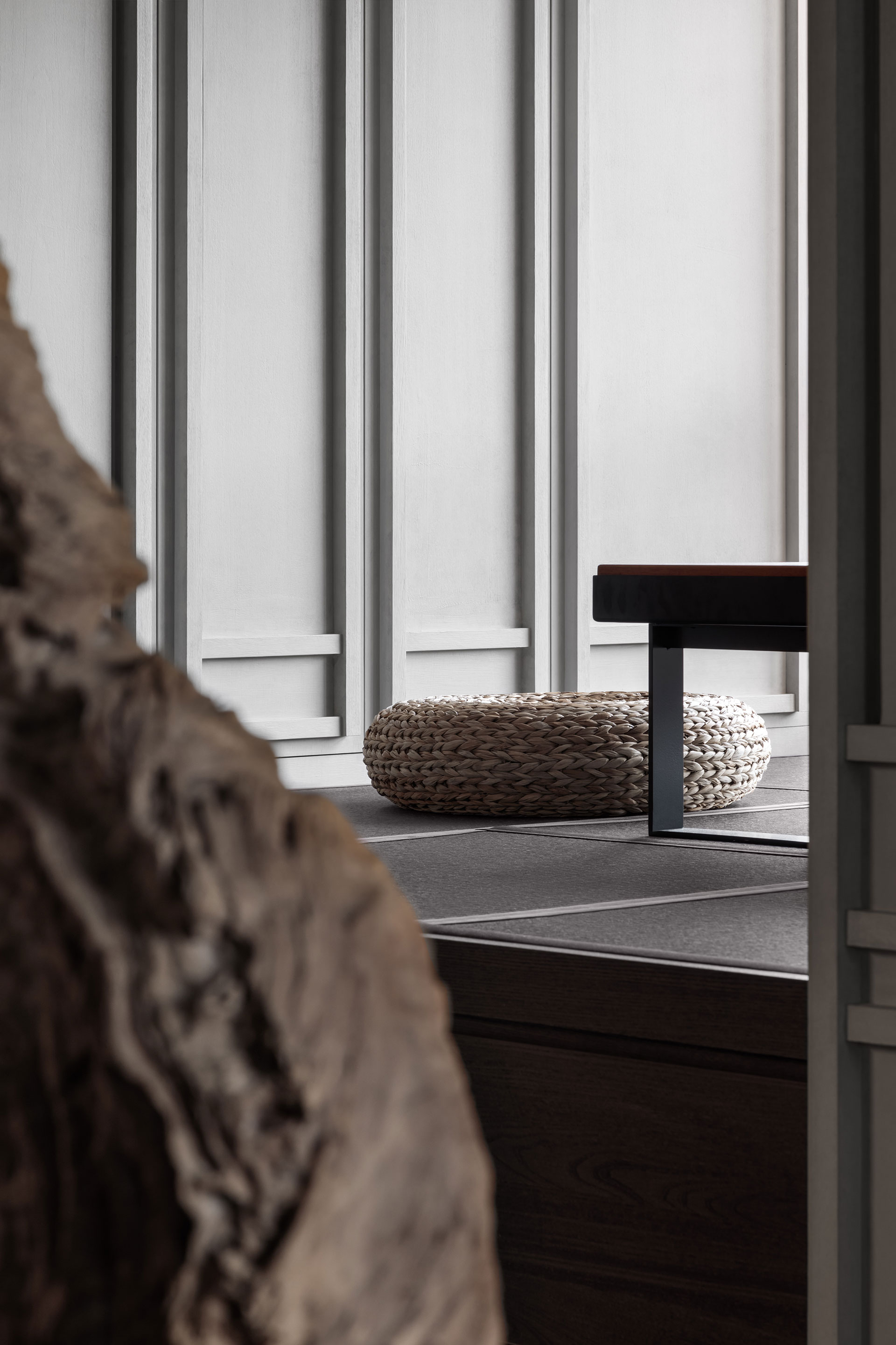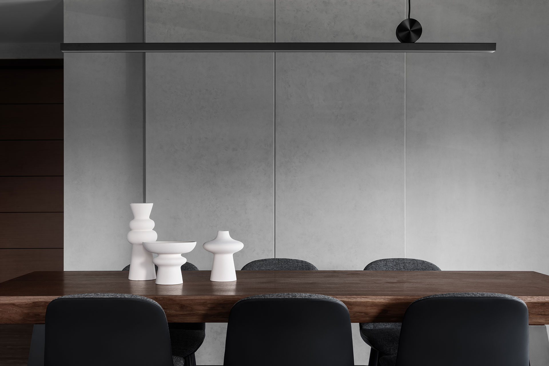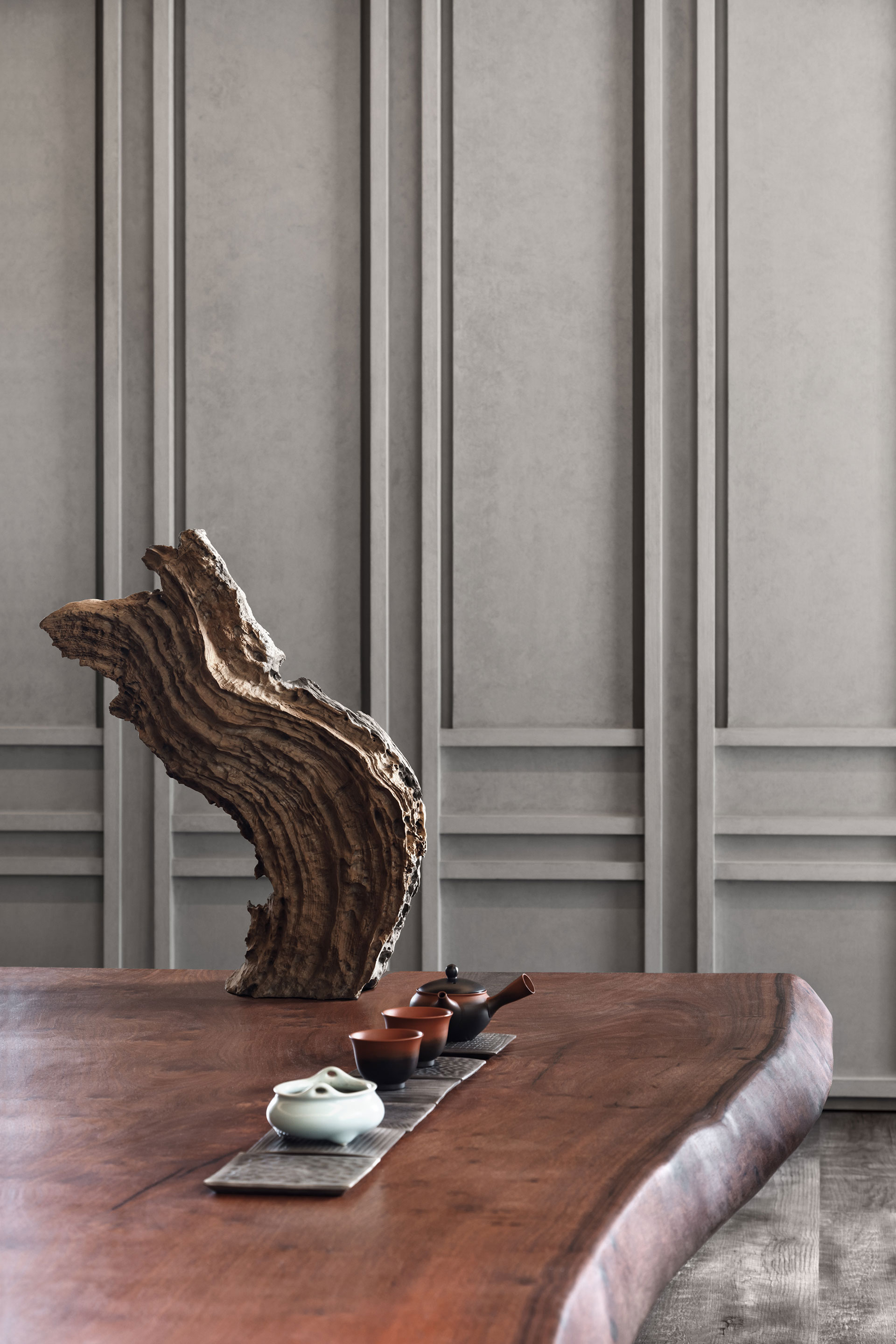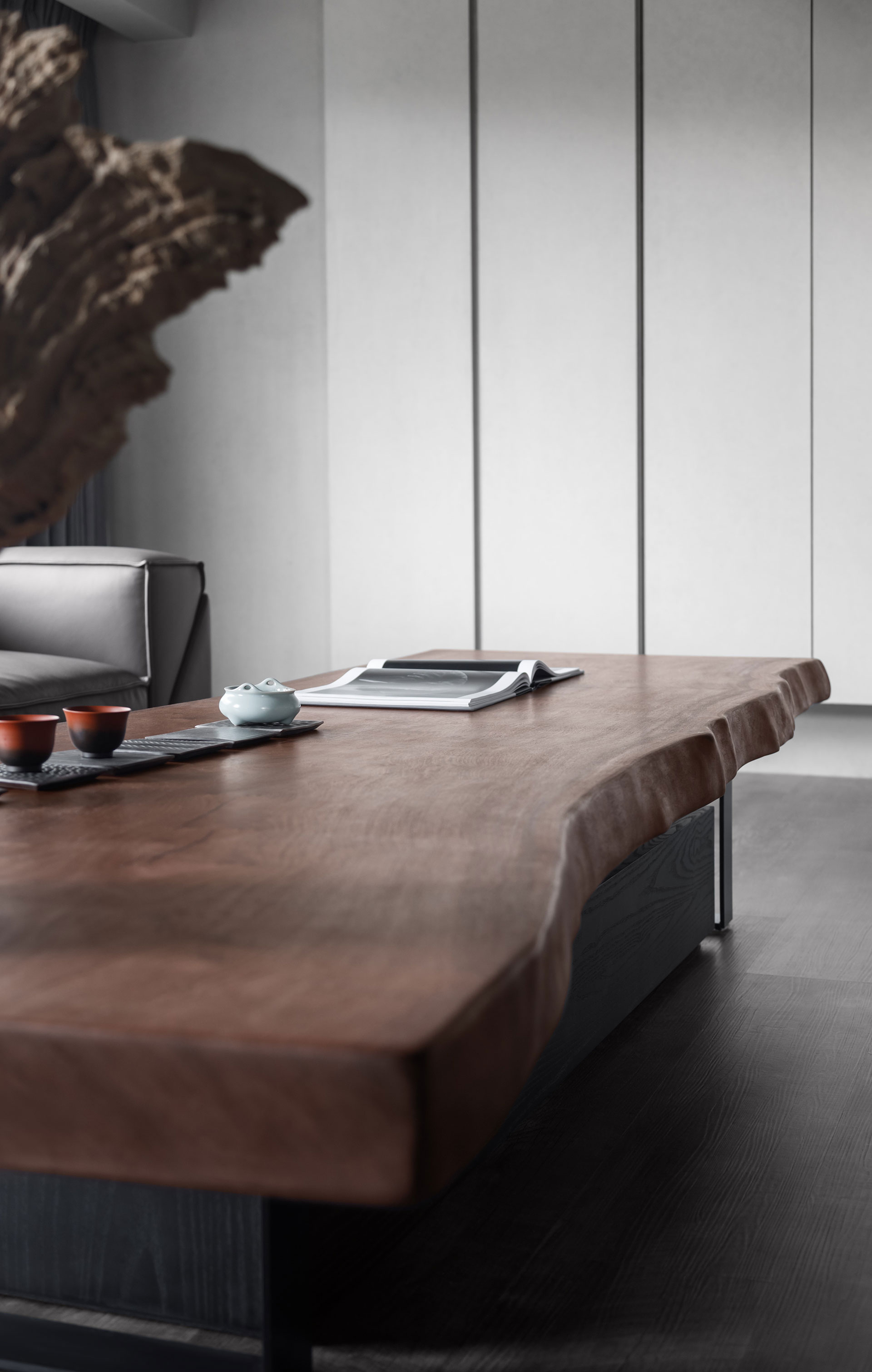 一個矩形完整的空間,用了一種最簡單的材質鋪陳出空間的基調,在此空間中置入二張大尺度原木長桌,長桌質樸的表面質感與自然有機的形體定義了空間的調性,同時暗喻乘載了屋主的個性,何謂合適的設計,應當就是 - 恰如其分,適得其所。