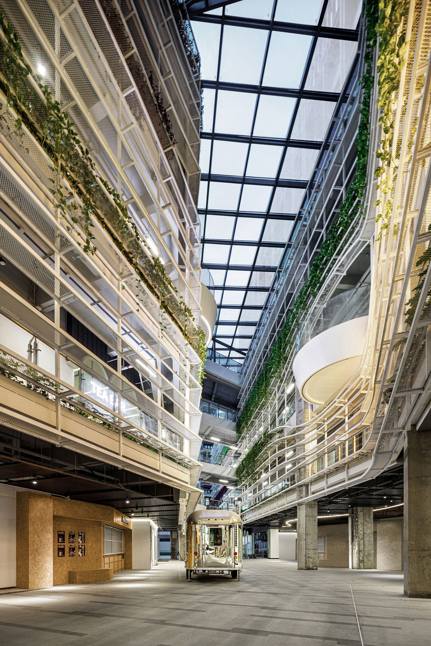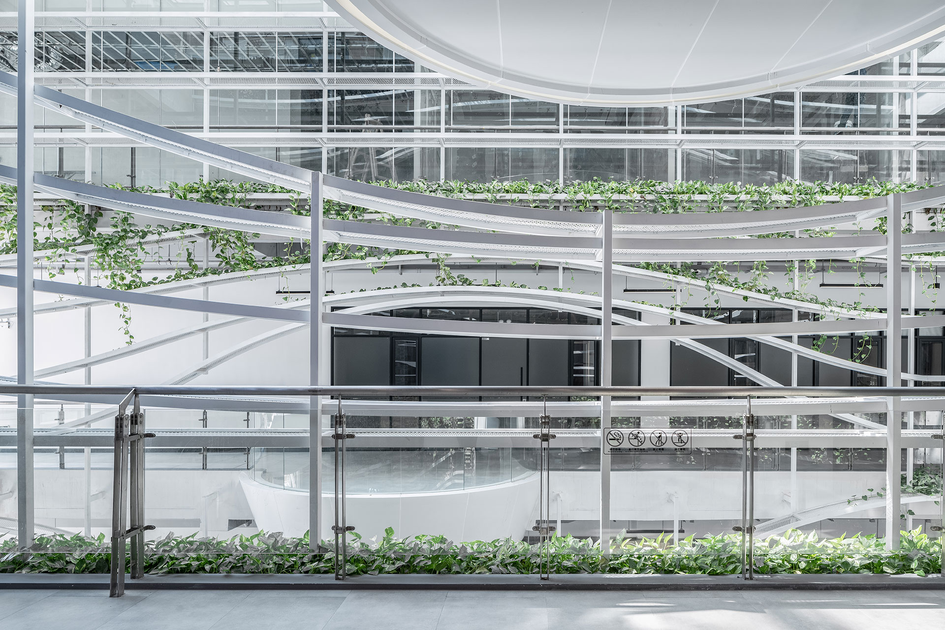 在建築物裙樓的中央軸線上,置換建築表皮引入生態綠牆,人們在此行走時猶如 進入一個綠牆山谷中,每一天的不同時刻,隨著太陽的移動,山壁上綠植的光影亦跟著不斷游移,為山谷裡的氛圍提供了時刻轉換的天然場景。隨著人們來到這山谷的時間不同,春夏秋冬,一年後,五年後,山壁上的綠植亦呈現出不同的生長樣貌,設計上期待塑造一可持續發展之生態環境,稱之為【活著的建築】。