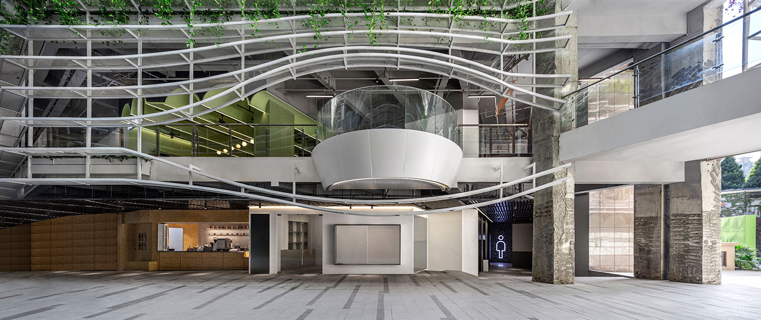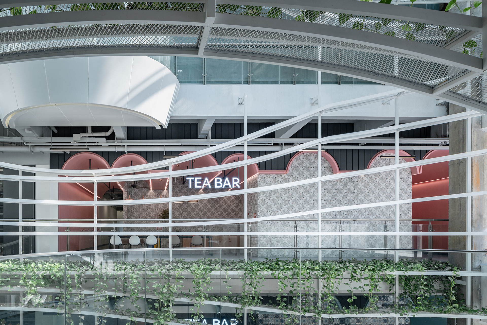 整個建築的裙樓樓層,透過中央生態綠軸線的挑空置入,各式商業與辦公活動交織成一種生活場景的共用社區表情,如同人們在山谷裡匯聚一般,同時也為社區注入了最重要的永續生態環境。