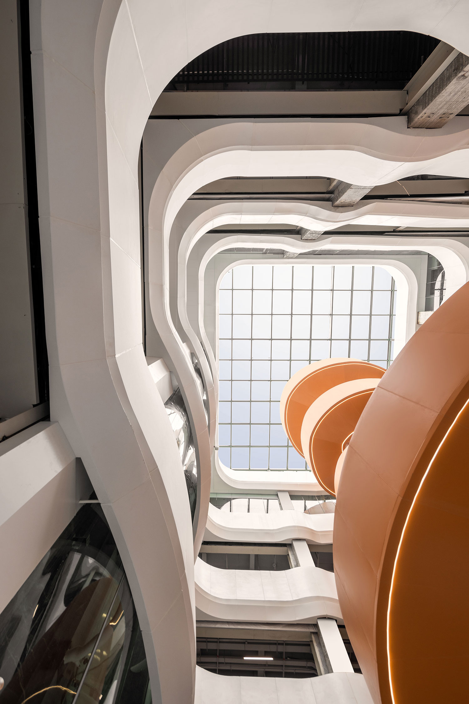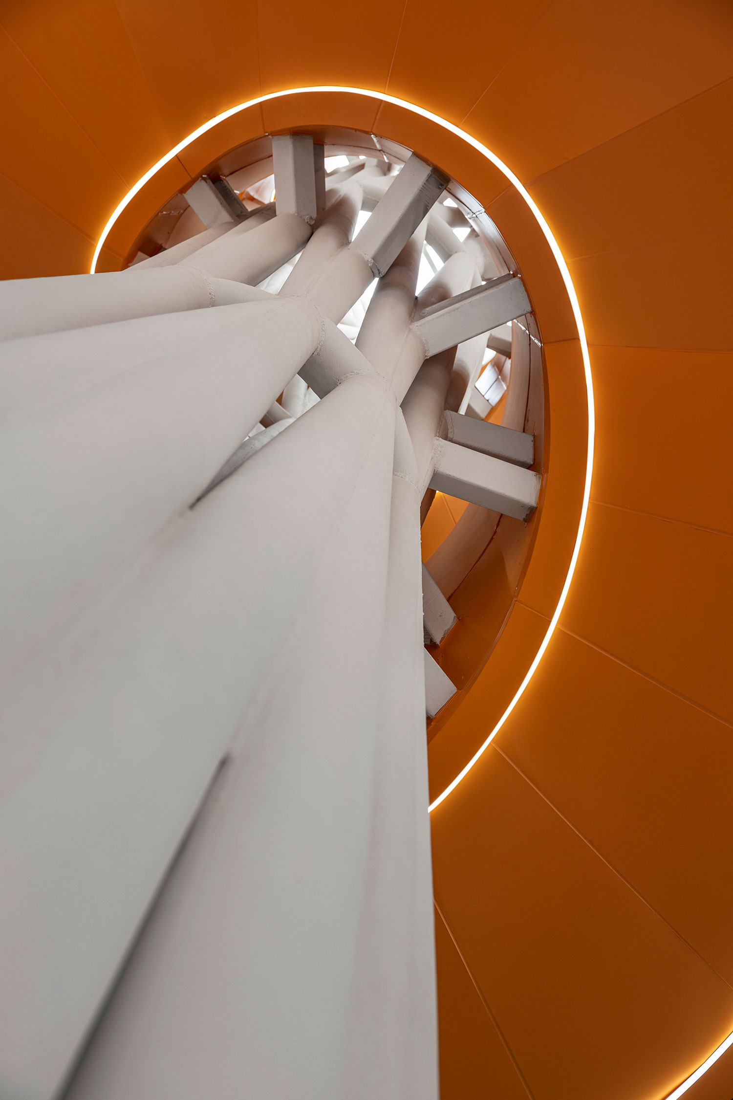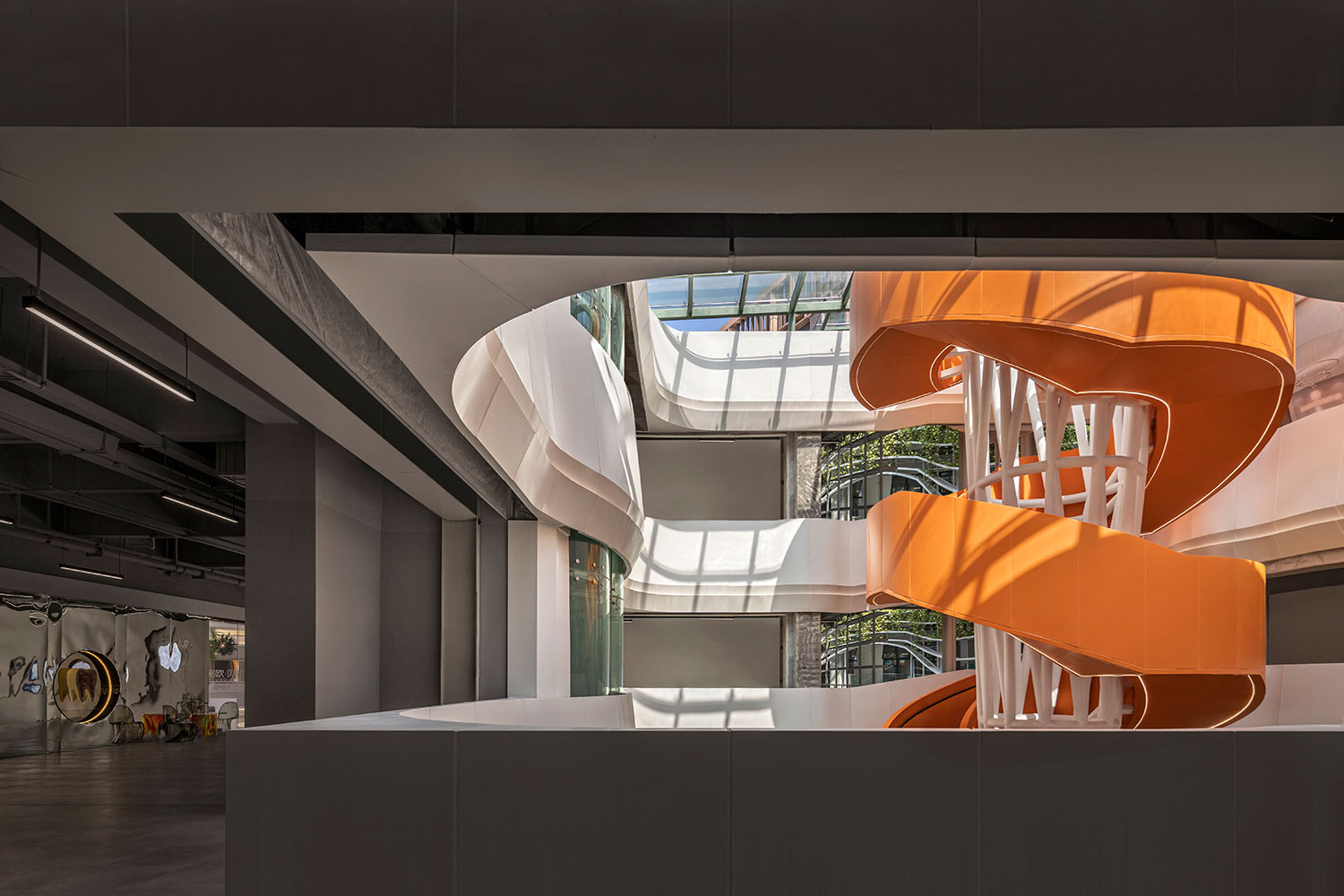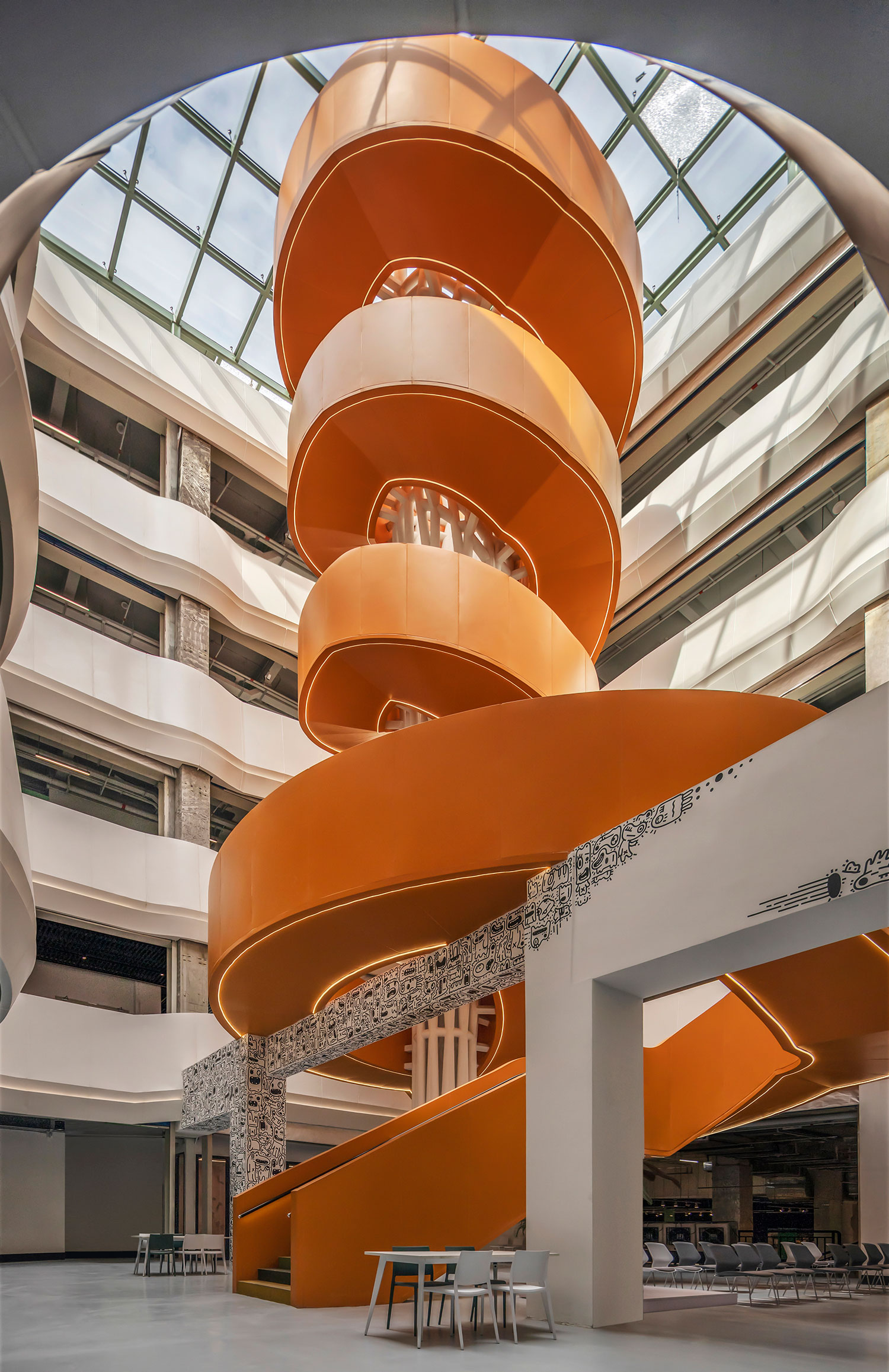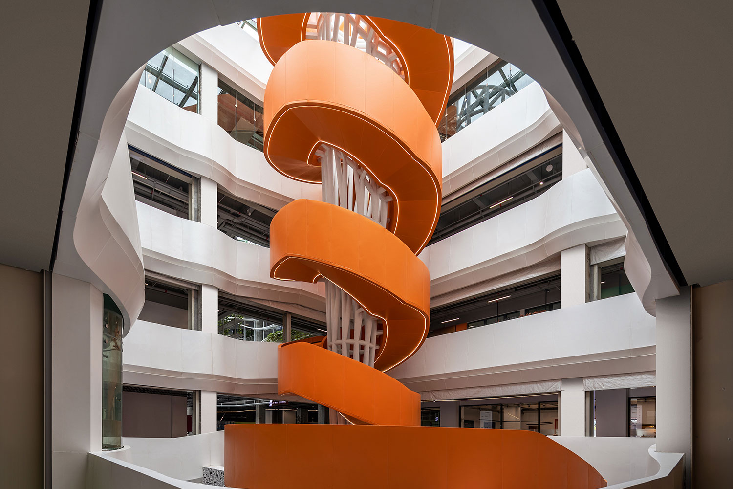 在南北向的中央生態軸線與串連東西向入口軸線交會處,設計利用原建築既有從負一層至四層之垂直挑空,設置一特殊造型之圓形樓梯。該樓梯的時尚造型在一層二條主要動線的交匯處顯得十分搶眼,目的在於將進入一層的人流吸引至裙樓其他的各個樓層,增強空間的垂直串聯,放大裙樓各樓層的商業效應,人們不僅可在一層各動線隨意探索,更能透過此圓形樓梯自然穿梭於各個樓層增強了本項目的商業活動體量。