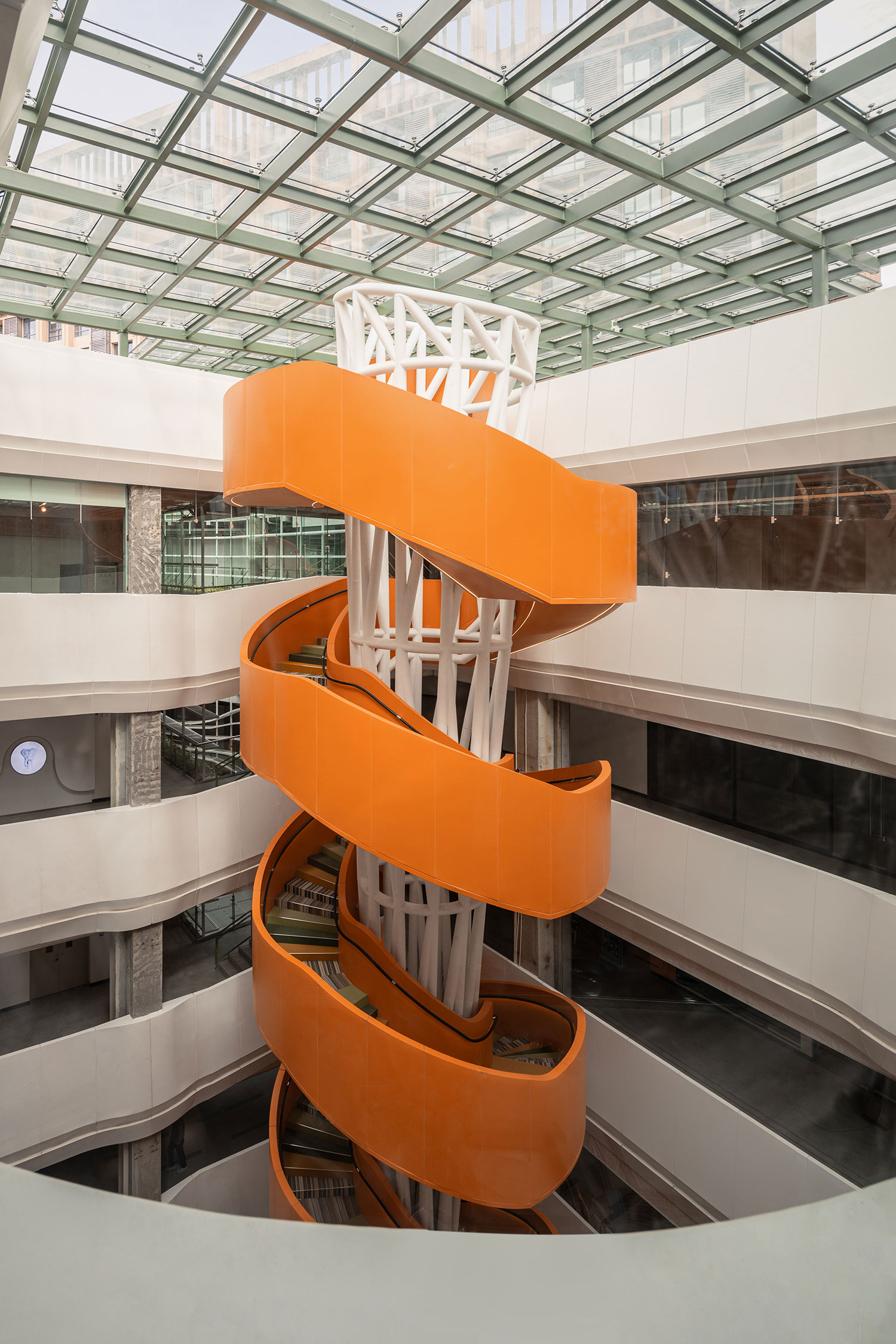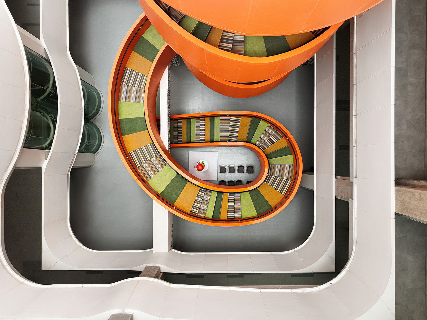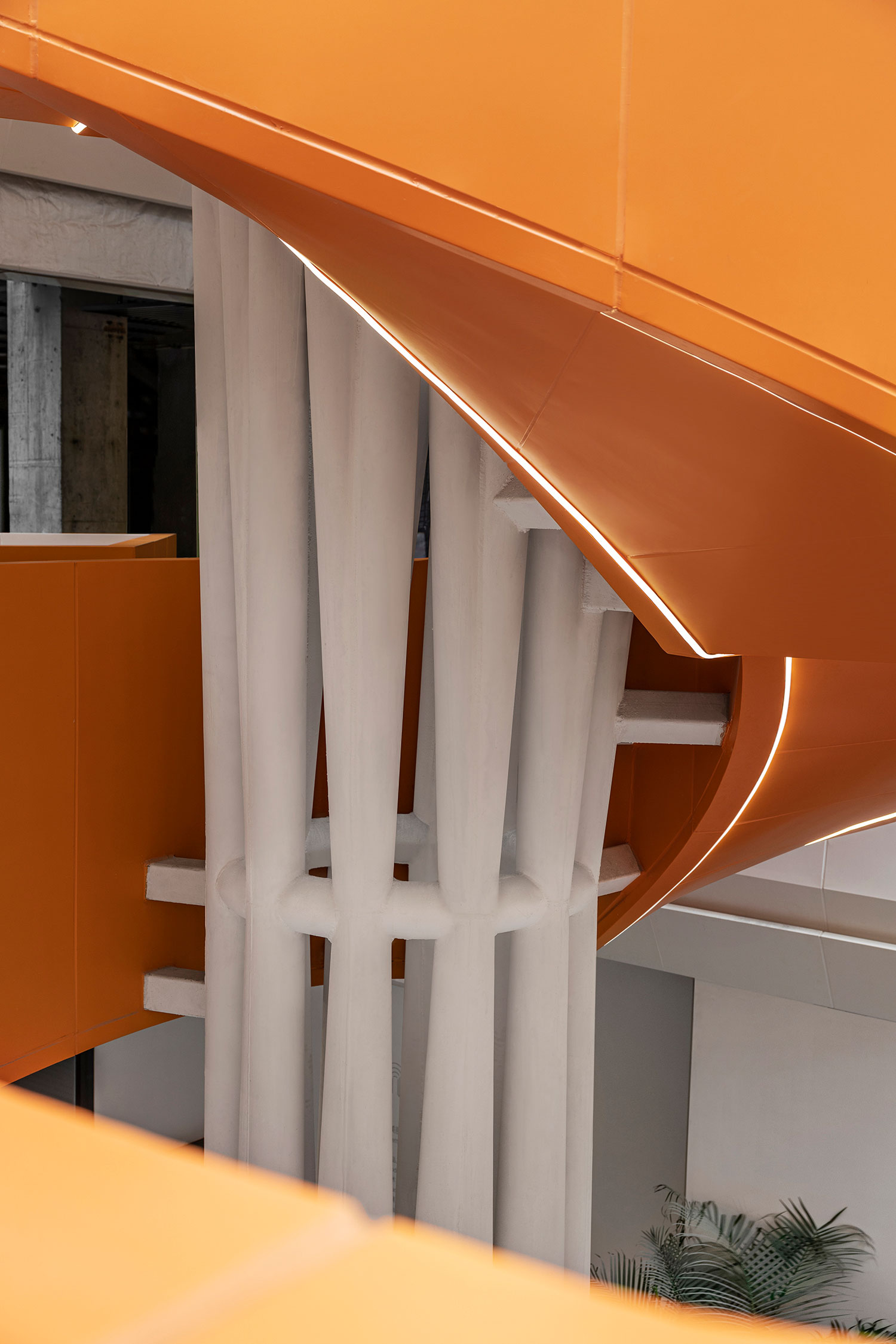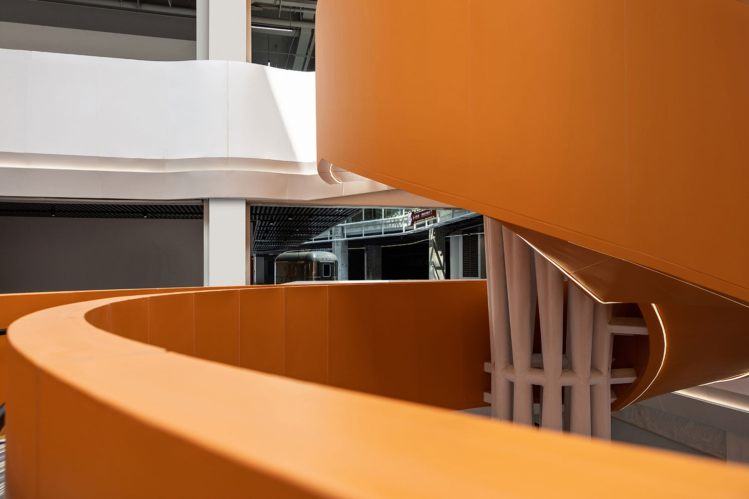在南北向的中央生態軸線與串連東西向入口軸線交會處,設計利用原建築既有從負一層至四層之垂直挑空,設置一特殊造型之圓形樓梯。該樓梯的時尚造型在一層二條主要動線的交匯處顯得十分搶眼,目的在於將進入一層的人流吸引至裙樓其他的各個樓層,增強空間的垂直串聯,放大裙樓各樓層的商業效應,人們不僅可在一層各動線隨意探索,更能透過此圓形樓梯自然穿梭於各個樓層增強了本項目的商業活動體量。