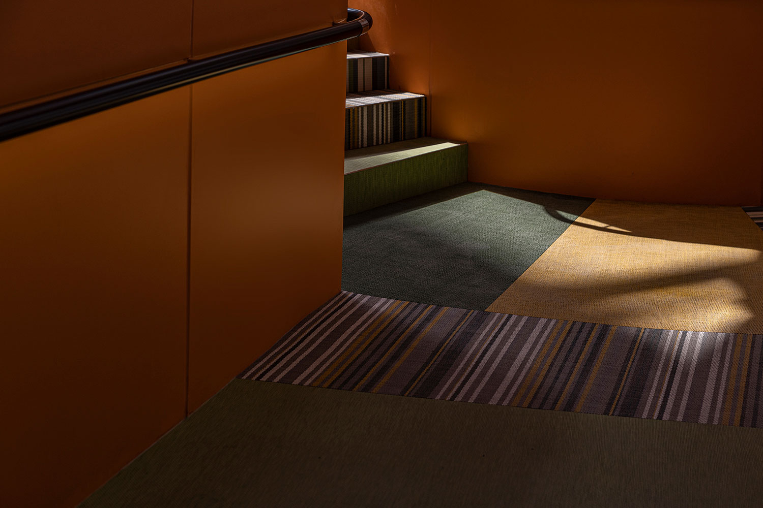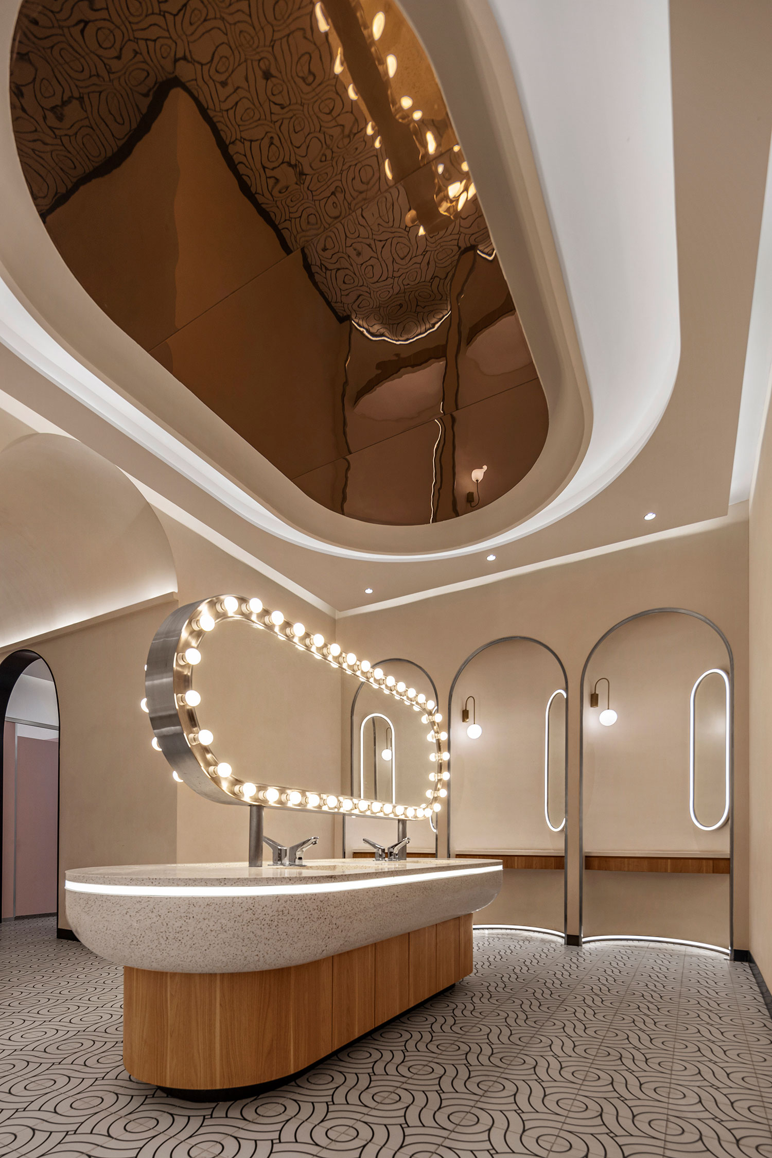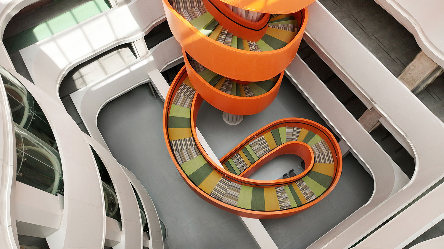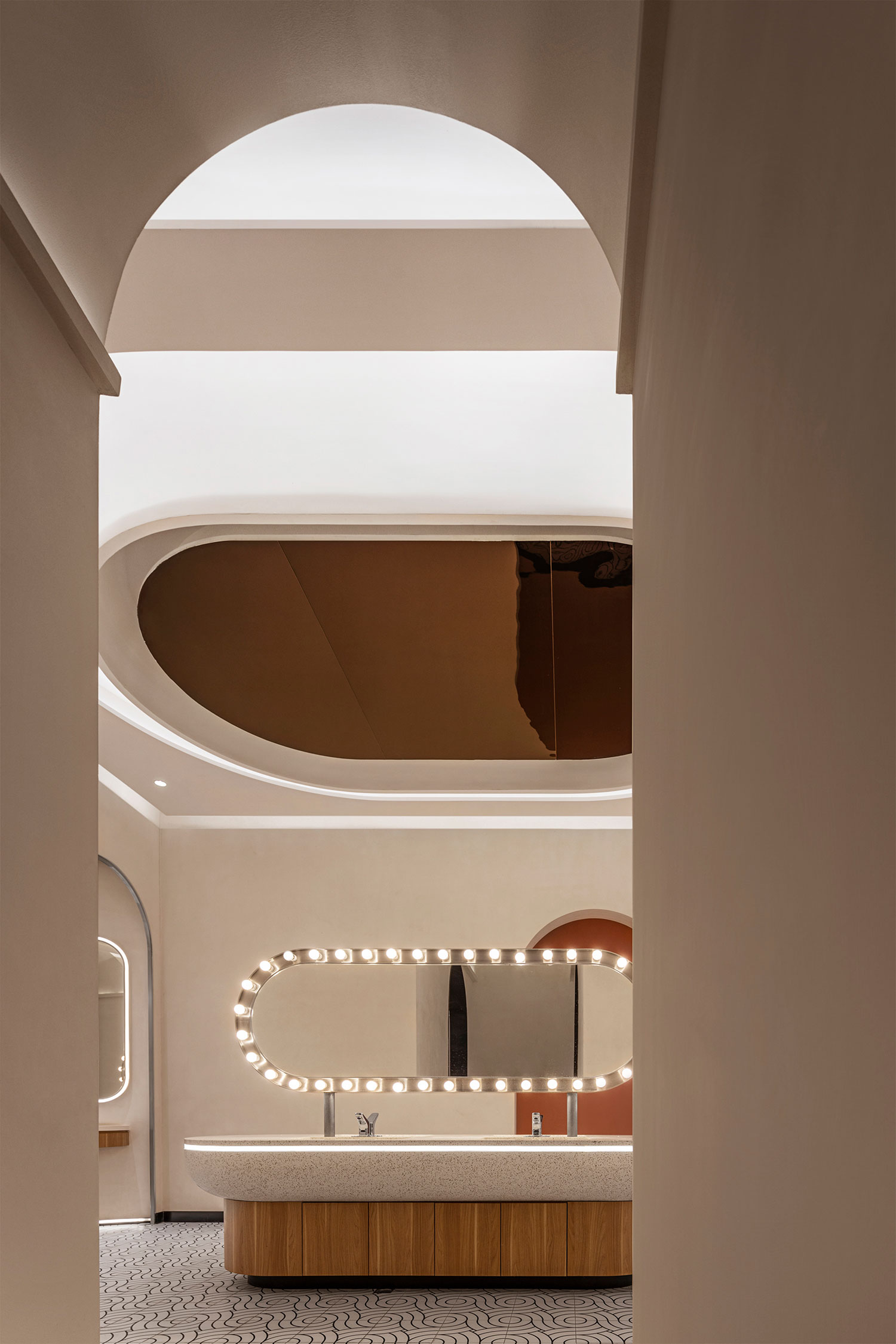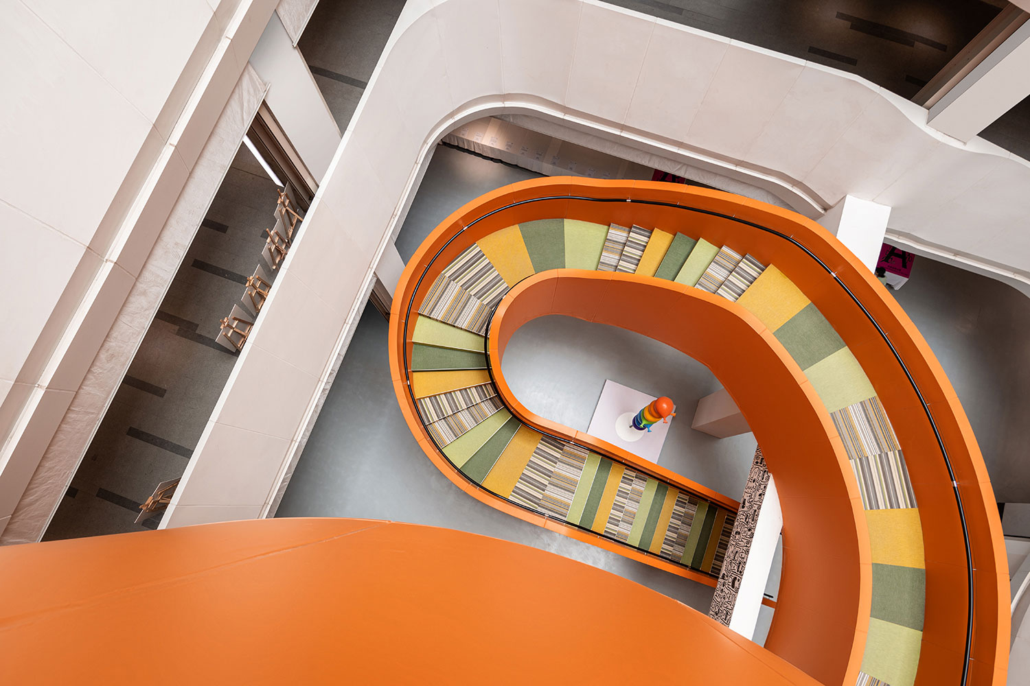 在南北向的中央生態軸線與串連東西向入口軸線交會處,設計利用原建築既有從負一層至四層之垂直挑空,設置一特殊造型之圓形樓梯。該樓梯的時尚造型在一層二條主要動線的交匯處顯得十分搶眼,目的在於將進入一層的人流吸引至裙樓其他的各個樓層,增強空間的垂直串聯,放大裙樓各樓層的商業效應,人們不僅可在一層各動線隨意探索,更能透過此圓形樓梯自然穿梭於各個樓層增強了本項目的商業活動體量。